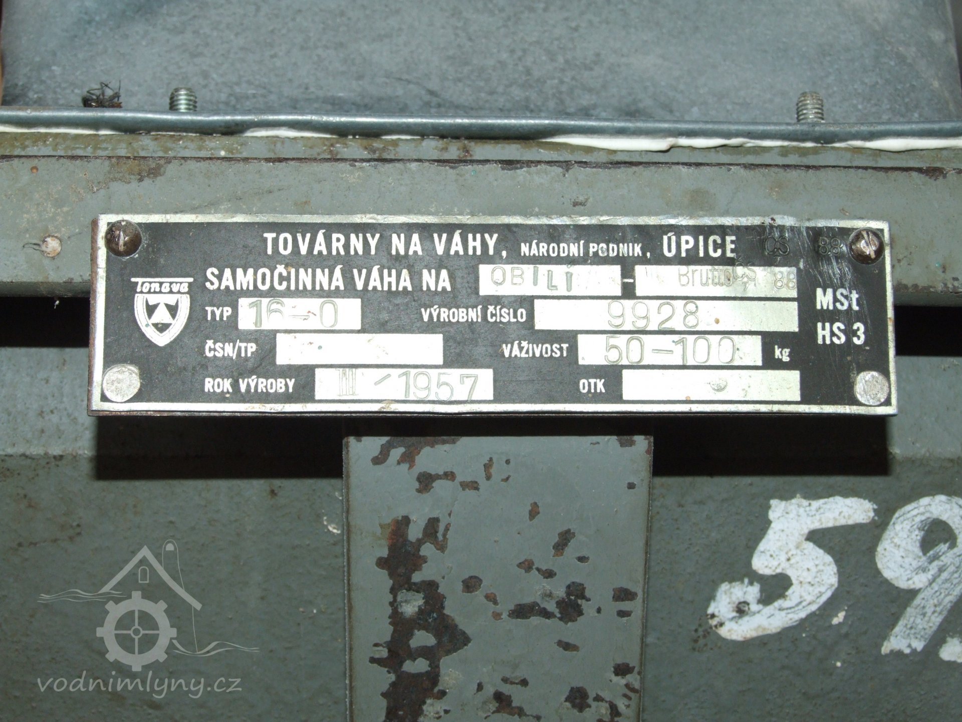 Mlýn Na Závodí č.p. 105, Holasovice – 1. patro: výrobní štítek samočinné váhy na obilí, červen 2023, © Jiří Hořák, (Prvky na obrázku: váha, značka výrobce na technologickém vybavení)