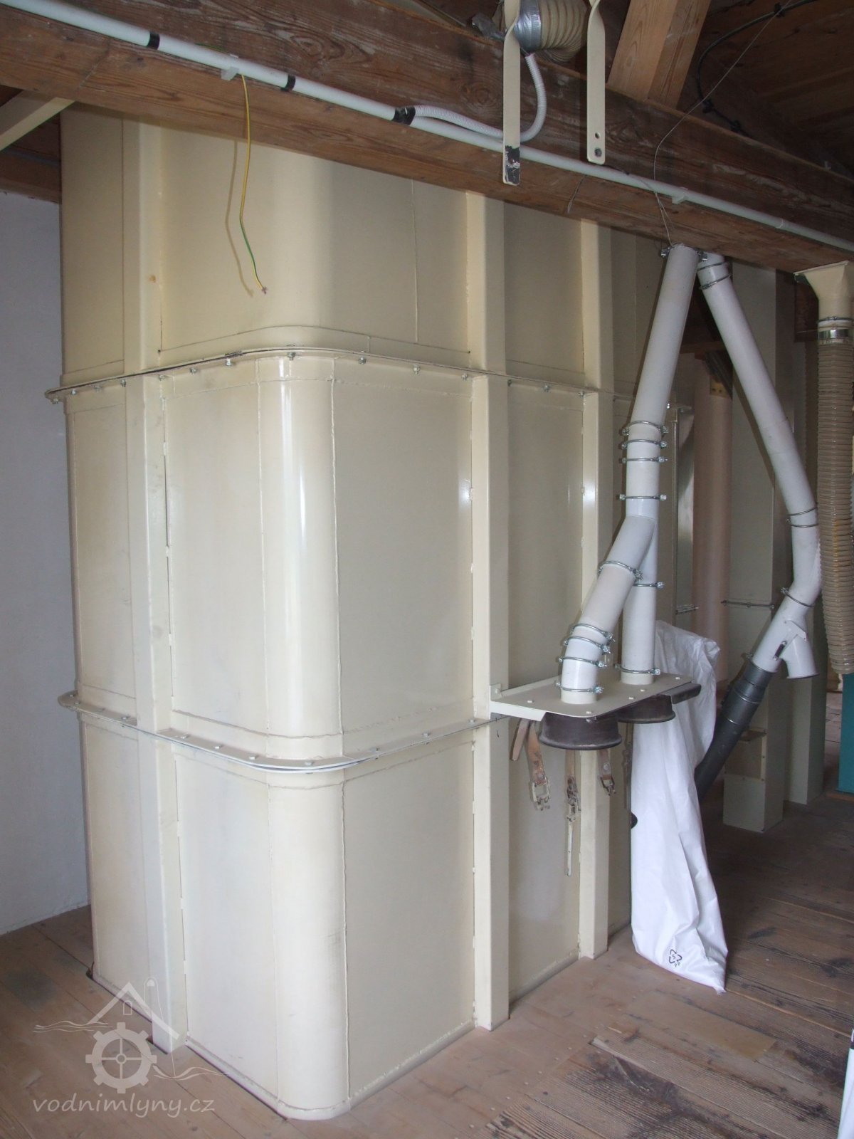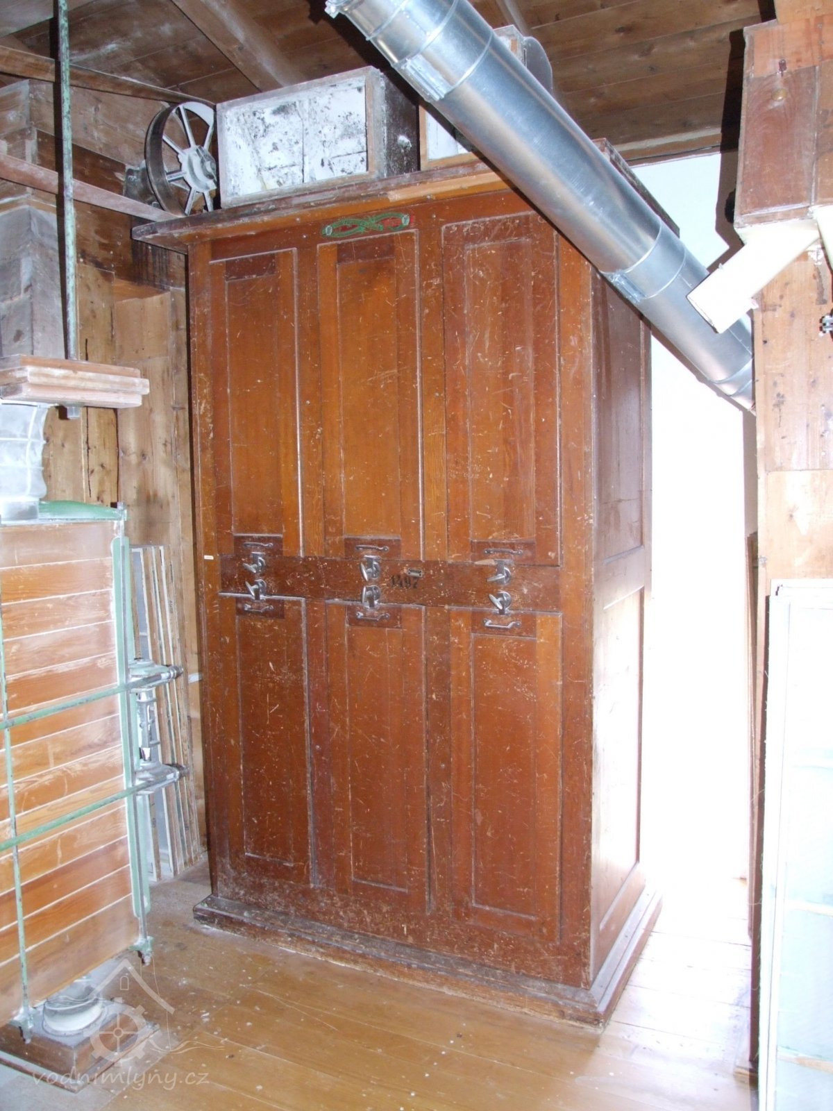 Mlýn Na Závodí č.p. 105, Holasovice – 2. patro: skříňový "hadicový" filtr z okupační éry, červen 2023, © Jiří Hořák