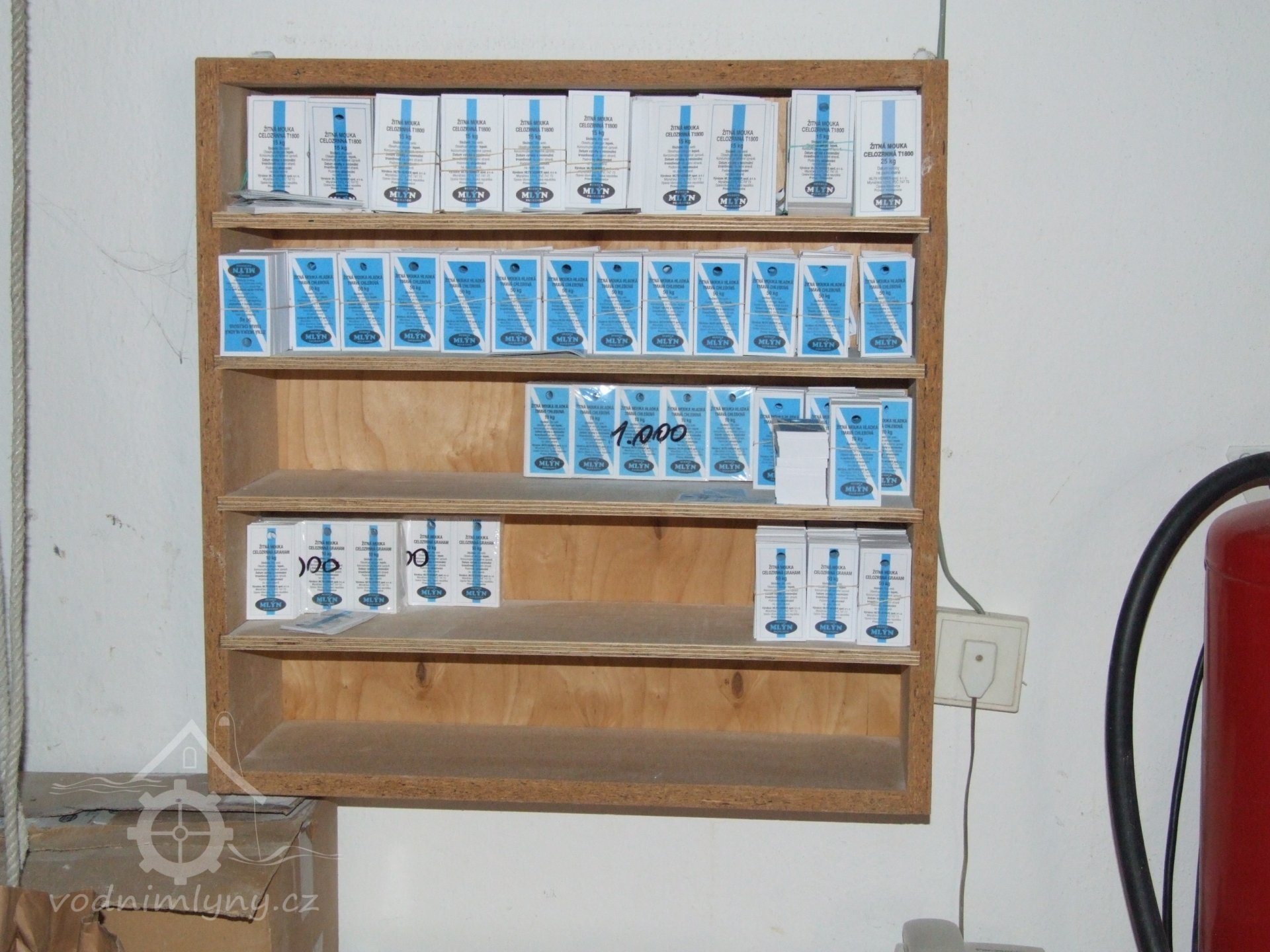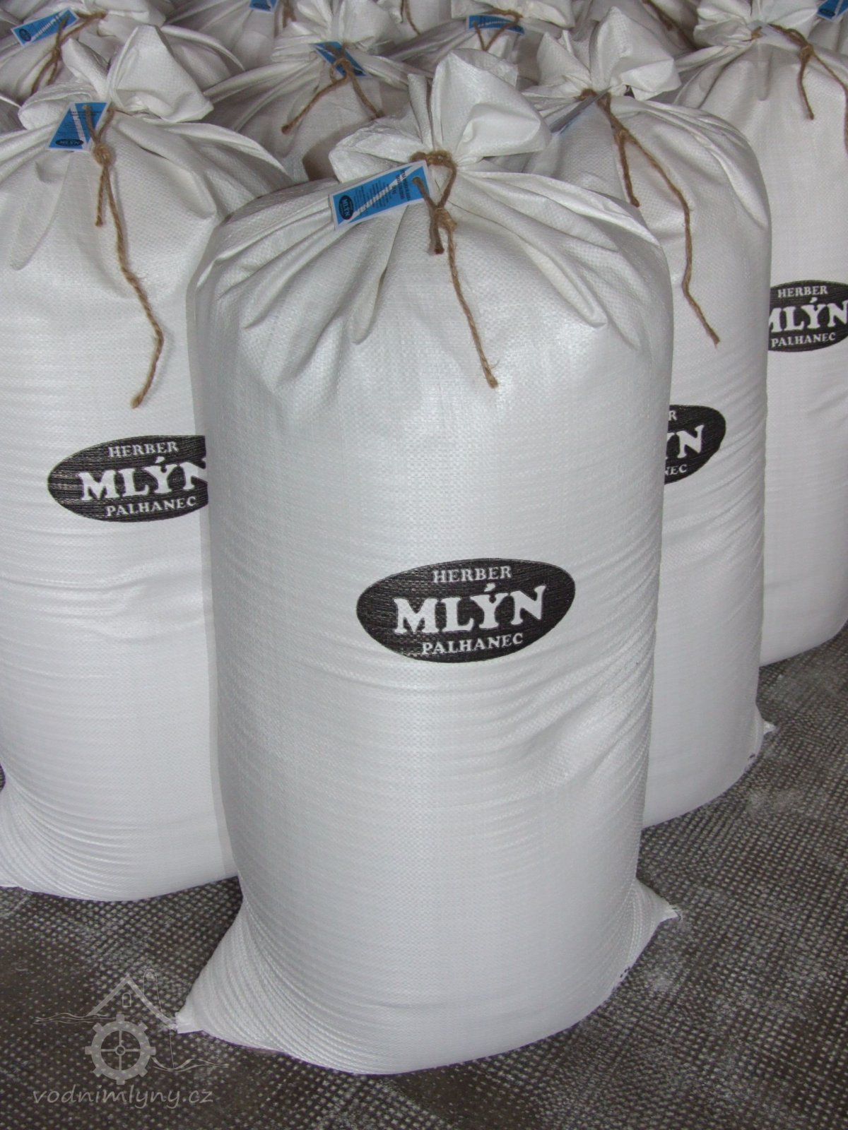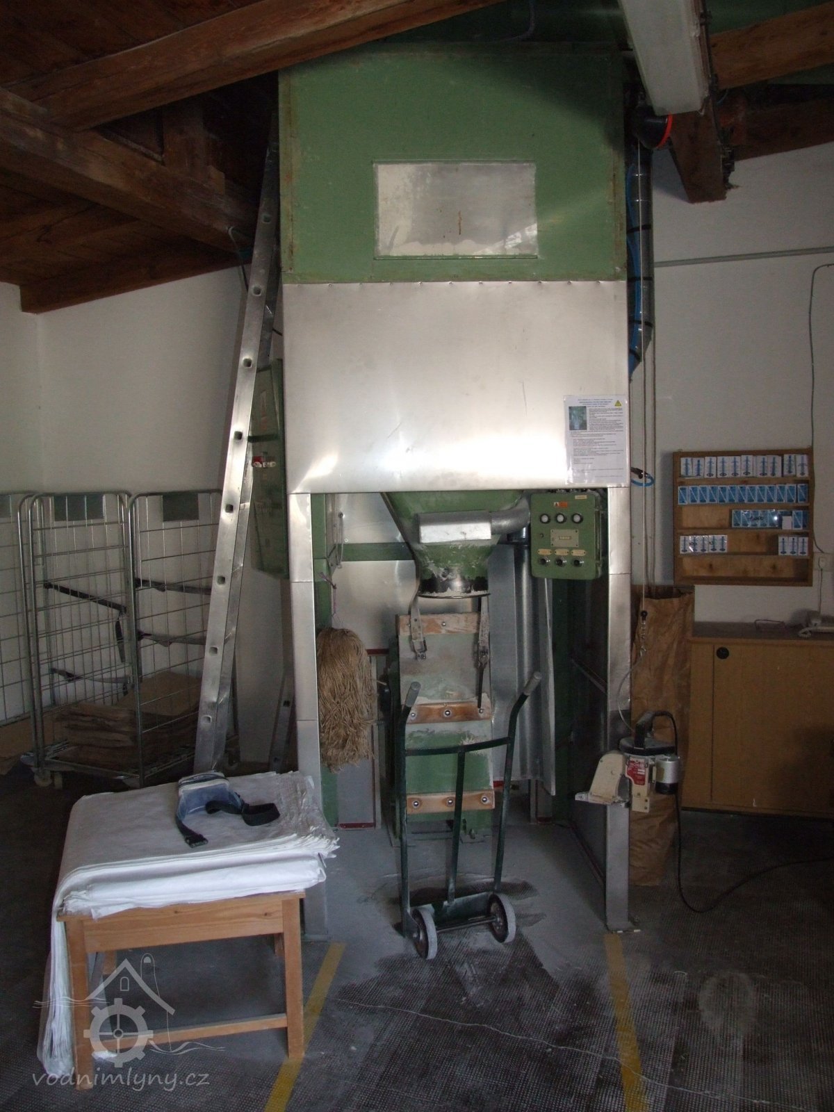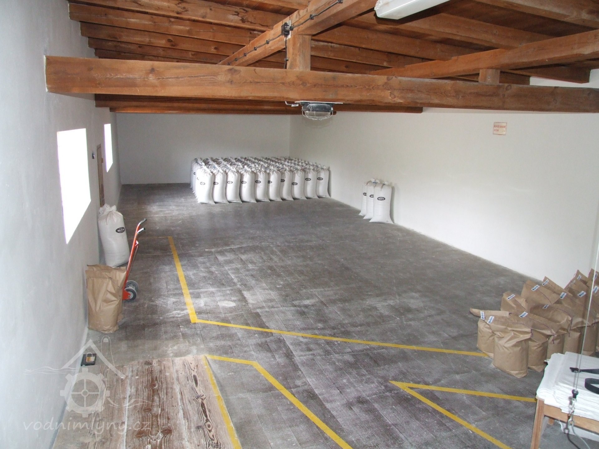 Mlýn Na Závodí č.p. 105, Holasovice – 1. patro: napytlovaná hotová česká (!!!!!!) mouka z českých (!!!!!!) klasů, červen 2023, © Jiří Hořák