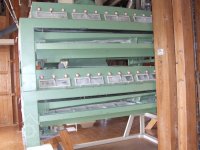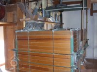 Mlýn Na Závodí č.p. 105, Holasovice – 2. patro: výměnné rámy se síty do rovinného hřídelového dvouskříňového vysévače (již jsou jiné než ty předdruhoválečné, nemají přímo zabudován vodící/oběžný ovál se sadou kartáčků s chloupky na stírání síta rámu), červen 2023, © Jiří Hořák, (Prvky na obrázku: vysévač rovinný)