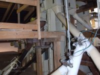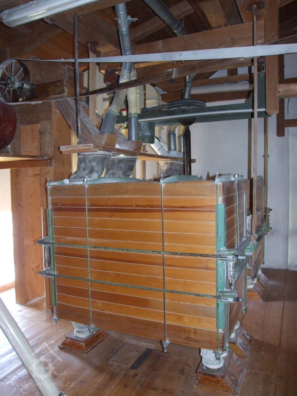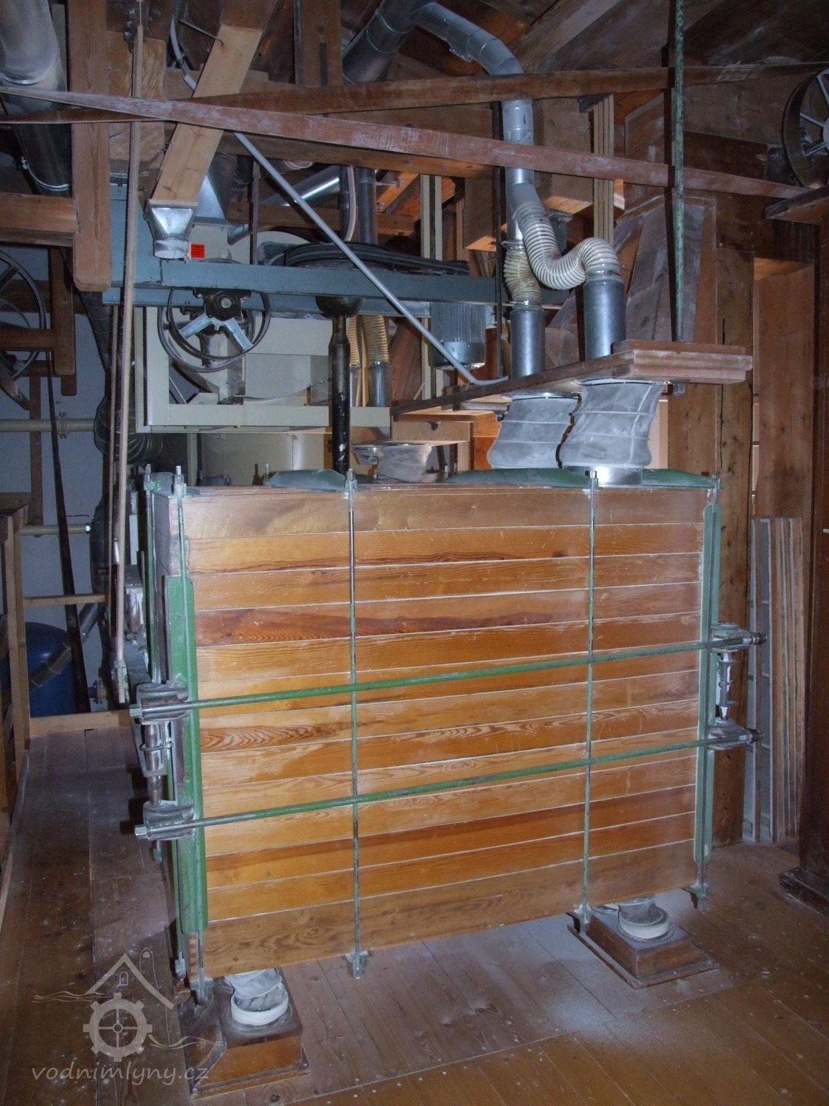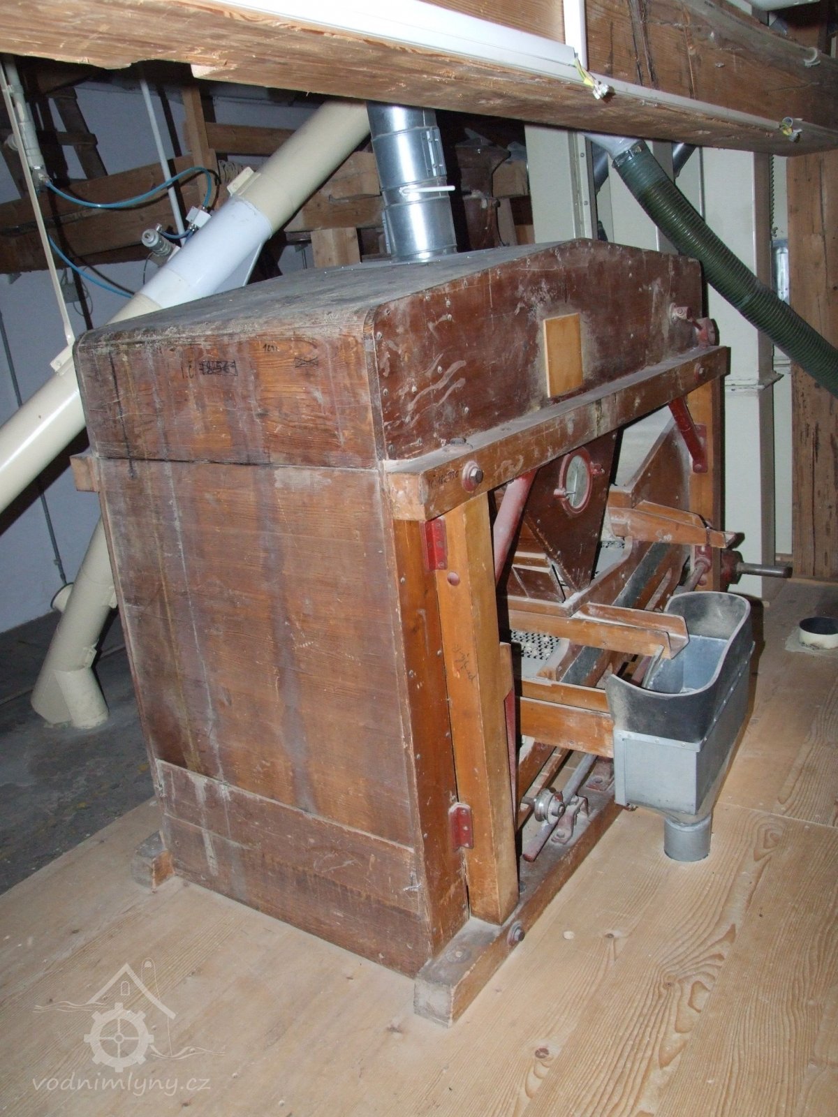 Mlýn Na Závodí č.p. 105, Holasovice – podstřeší: sítový třídič s aspirační skříní čističky surovin. Čistí zrno od hrubých nečistot, plev, klasů atd., něco jako moderní aspiratér, červen 2023, © Jiří Hořák, (Prvky na obrázku: aspiratér)
