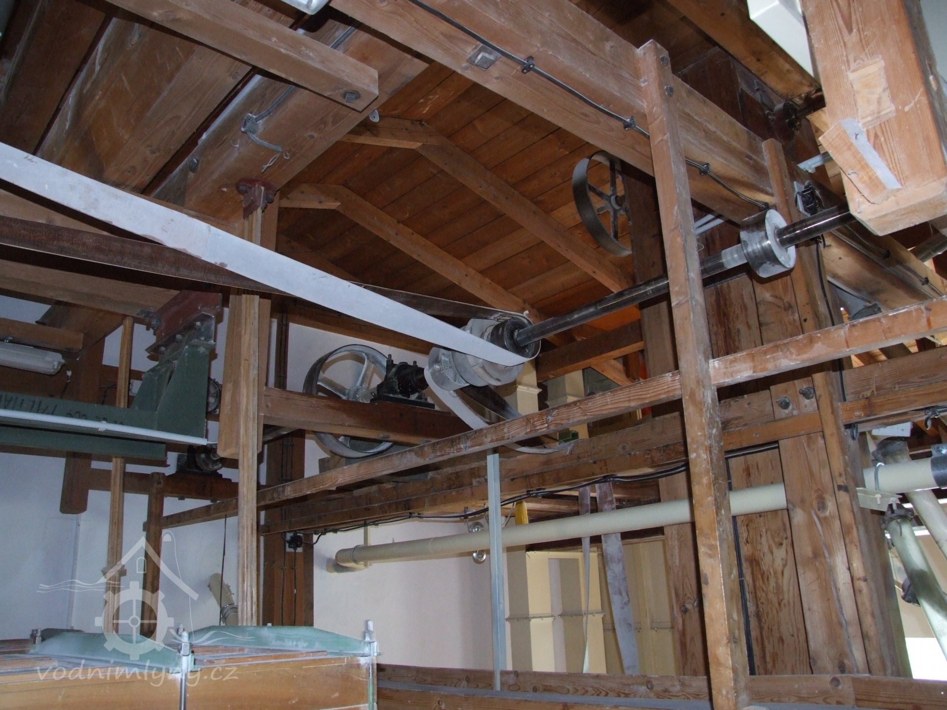 Mlýn Na Závodí č.p. 105, Holasovice – 2. patro: horní (rozvodová) mlýnská transmise, červen 2023, © Jiří Hořák, (Prvky na obrázku: transmise, řemenice, převody - transmisní hřídele s řemenicemi (výrobek průmyslový i řemeslný))