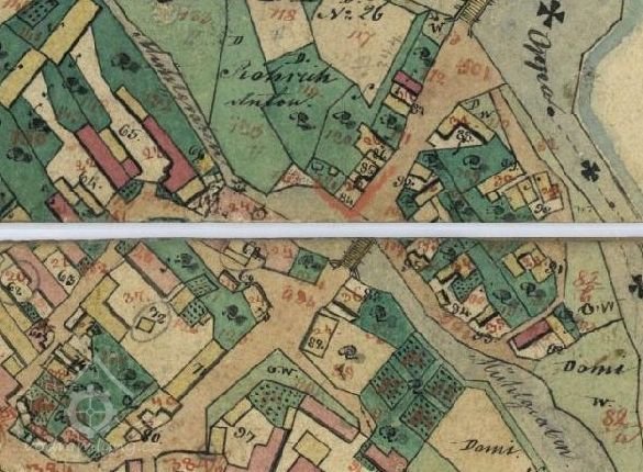 Mlýn Na Závodí č.p. 105, Holasovice – vodní právo: horní mlýnská strouha se blíží k Červenému mlýnu (voda protékala zprava doleva), říjen 2021, © Jiří Hořák, (Prvky na obrázku: náhon)