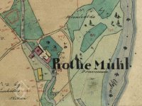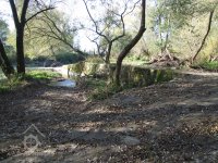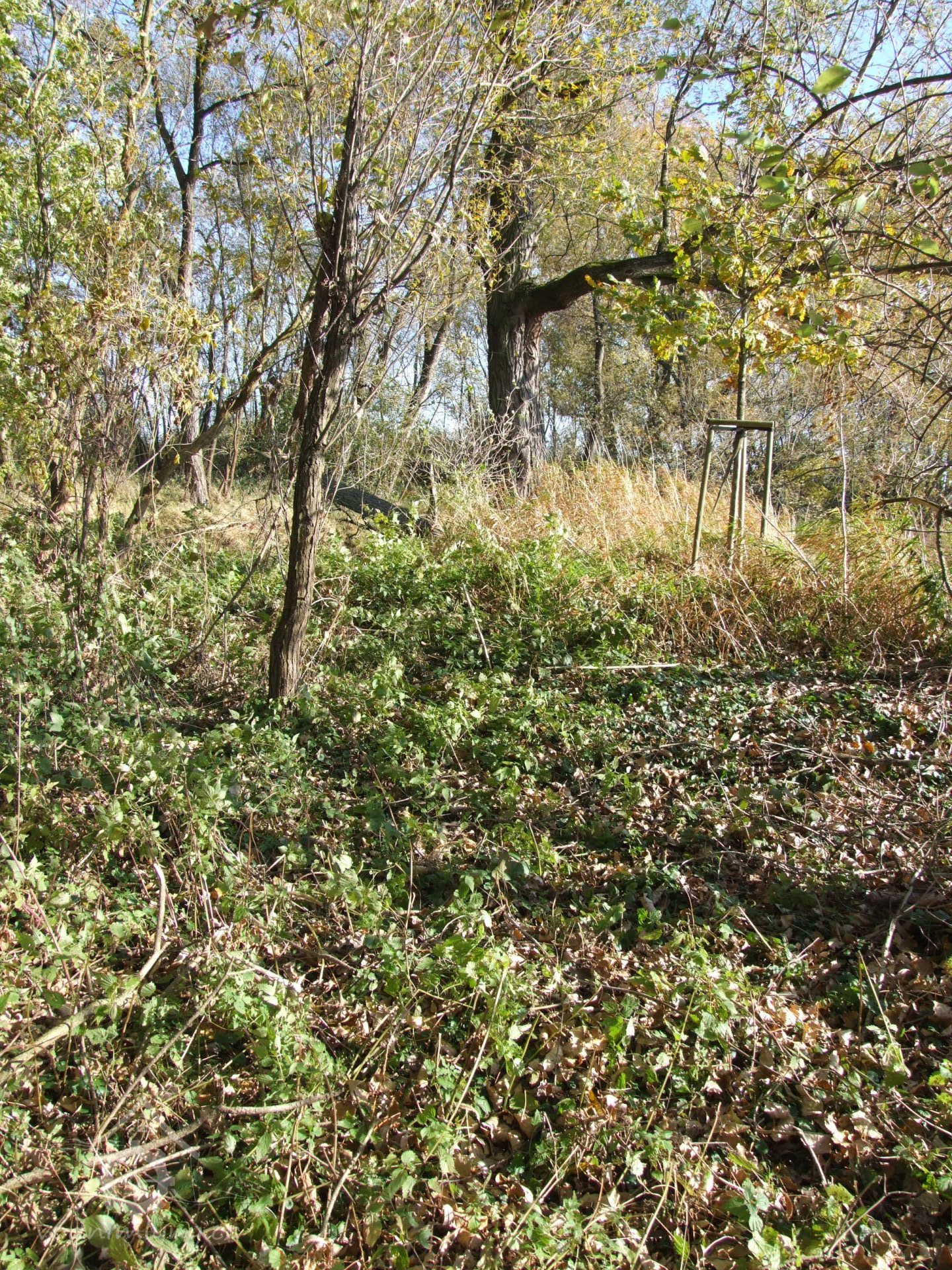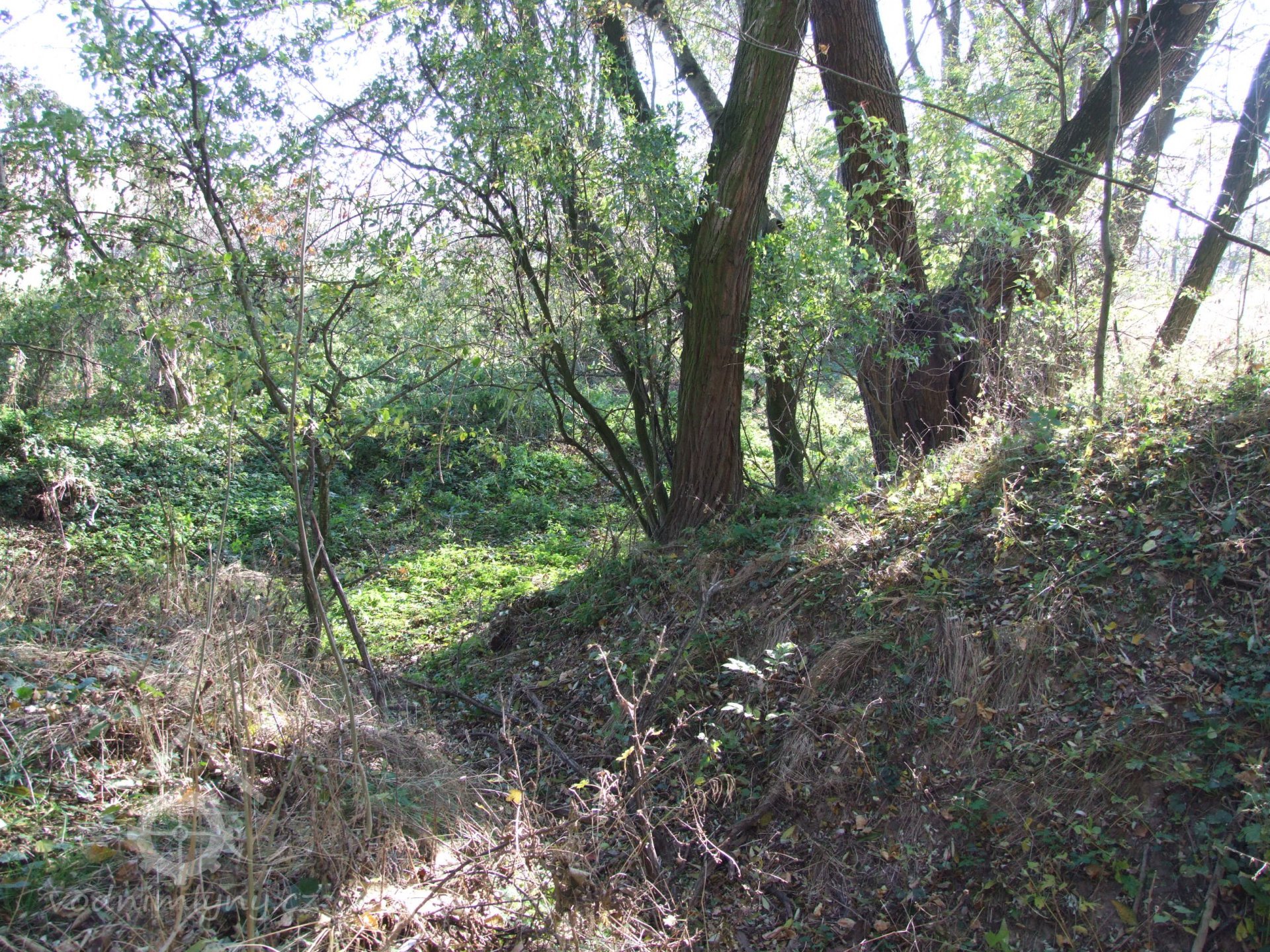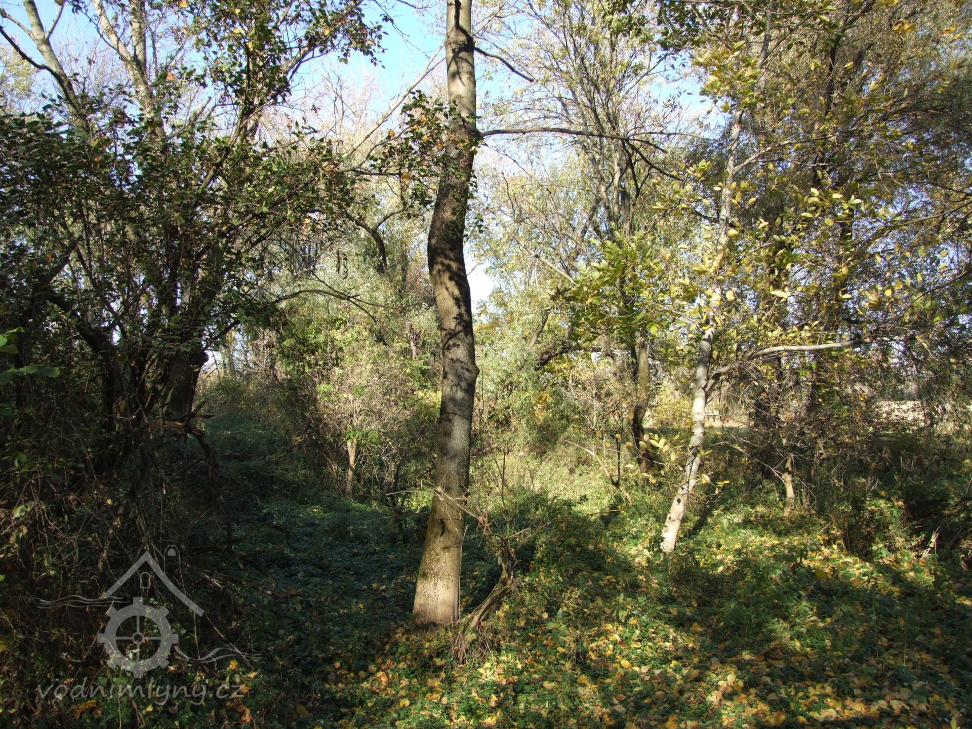Červený mlýn č.p. 73, Holasovice – vodní právo: 'jalový odpad', spíše vracečka, již dnes vůbec neexistuje a trasu možno poznat jen dle historických specializovaných vodohospodářských map a pak v terénu podle nich jít a neuhnout. Koryto bylo uprostřed fotografie (fotografováno po vodě), říjen 2021, © Jiří Hořák, (Prvky na obrázku: náhon)