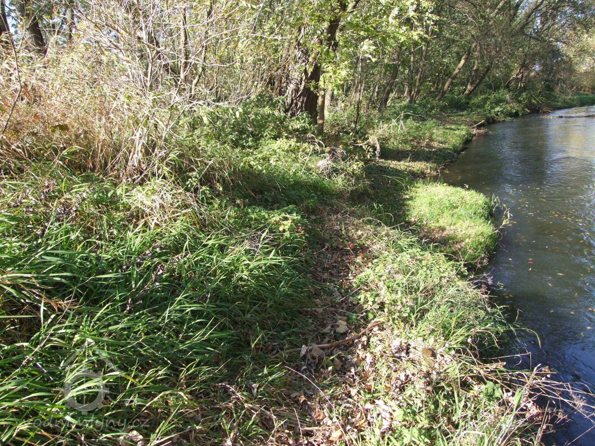 Červený mlýn č.p. 73, Holasovice – vodní právo: horní mlýnská strouha již na kraji obce (fotografováno po vodě), říjen 2021, © Jiří Hořák, (Prvky na obrázku: náhon)