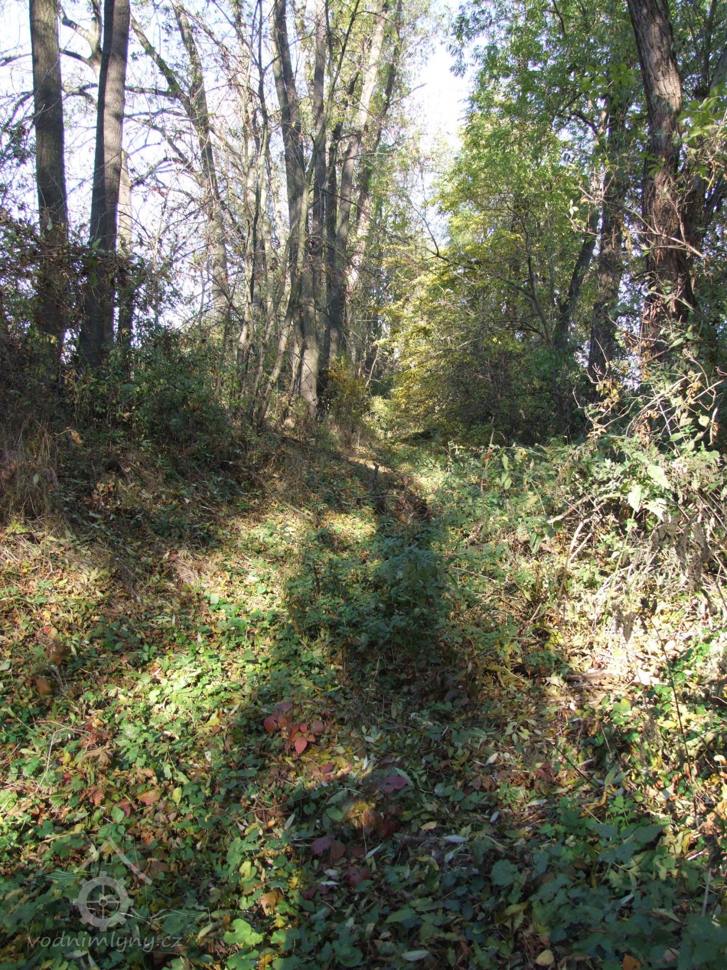 Červený mlýn č.p. 73, Holasovice – vodní právo: horní mlýnská strouha za Červeným mlýnem (voda protékala zleva doprava), říjen 2021, © Jiří Hořák, (Prvky na obrázku: náhon)