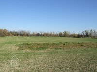 Červený mlýn č.p. 73, Holasovice – vodní právo: z horní mlýnské strouhy v km 1,767 přes manipulační objekt odbočuje doleva 'jalový odpad', spíše vracečka (voda ve strouze protékala zleva doprava a odbočka vracečky s manipulačním objektem je v prohlubni zhruba uprostřed fotografie), říjen 2021, © Jiří Hořák, (Prvky na obrázku: náhon)