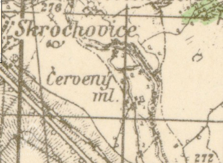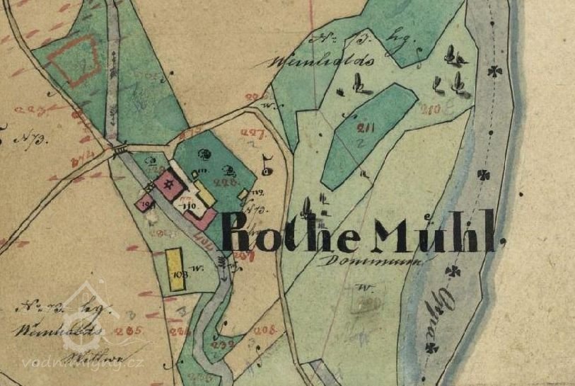 Červený mlýn č.p. 73, Holasovice – vodní právo: horní mlýnská strouha je lemována stromy i keři, a tak ji lze i na dálku poznat (voda protékala zprava doleva), říjen 2021, © Jiří Hořák, (Prvky na obrázku: náhon)