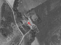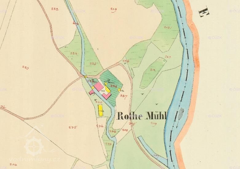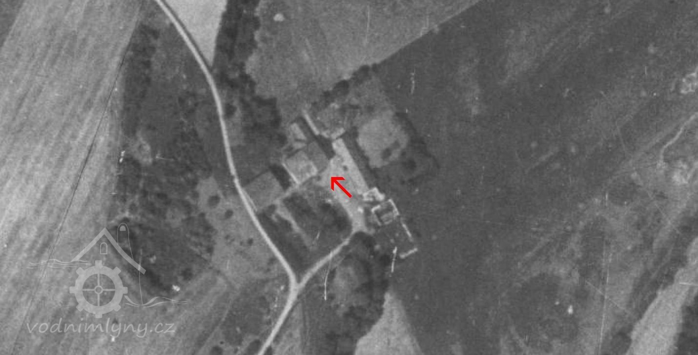 Červený mlýn č.p. 73, Holasovice – vodní právo: horní mlýnská strouha se blíží k Červenému mlýnu (voda protékala zprava doleva), říjen 2021, © Jiří Hořák, (Prvky na obrázku: náhon)