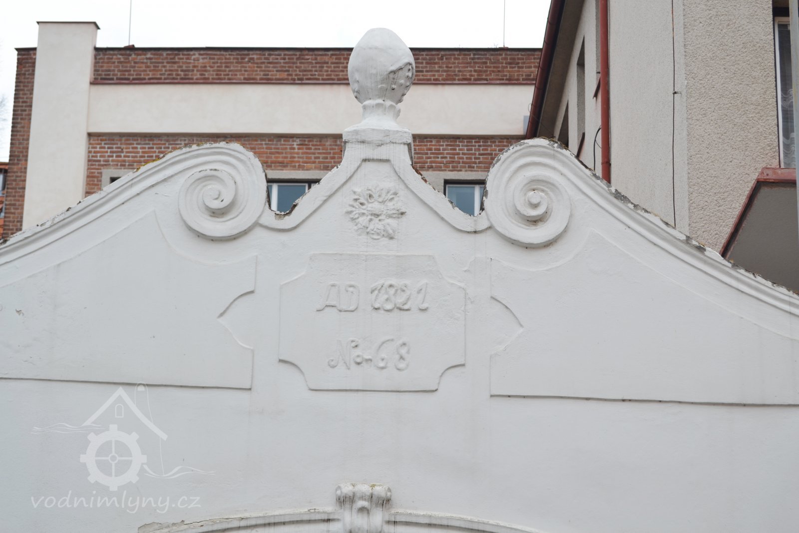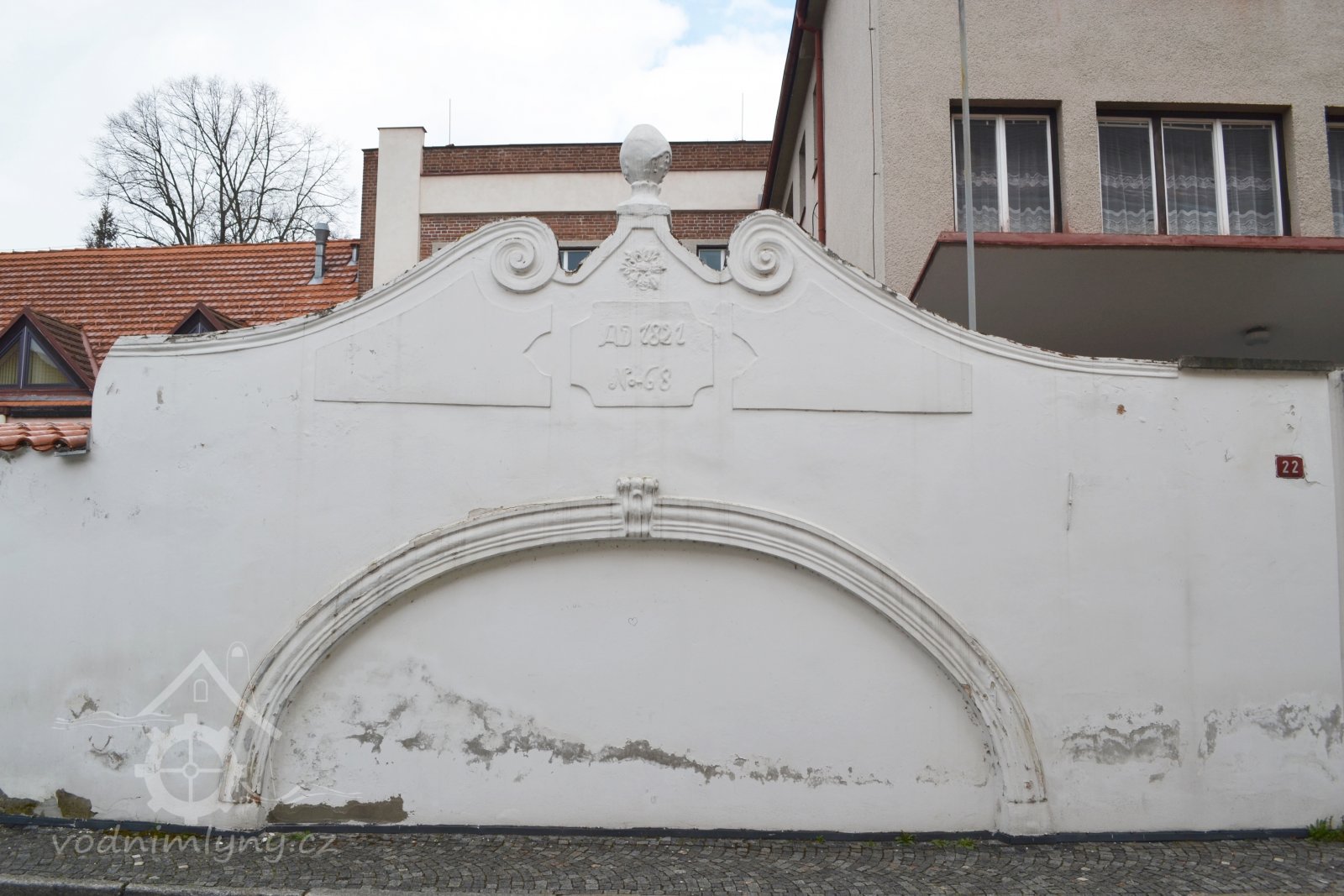 Dnes již zazděná brána do bývalého mlýna, zaklenutá polokruhem s volutovým štítem a piniovou šiškou nad vjezdem. Datována je letopočtem 1821.