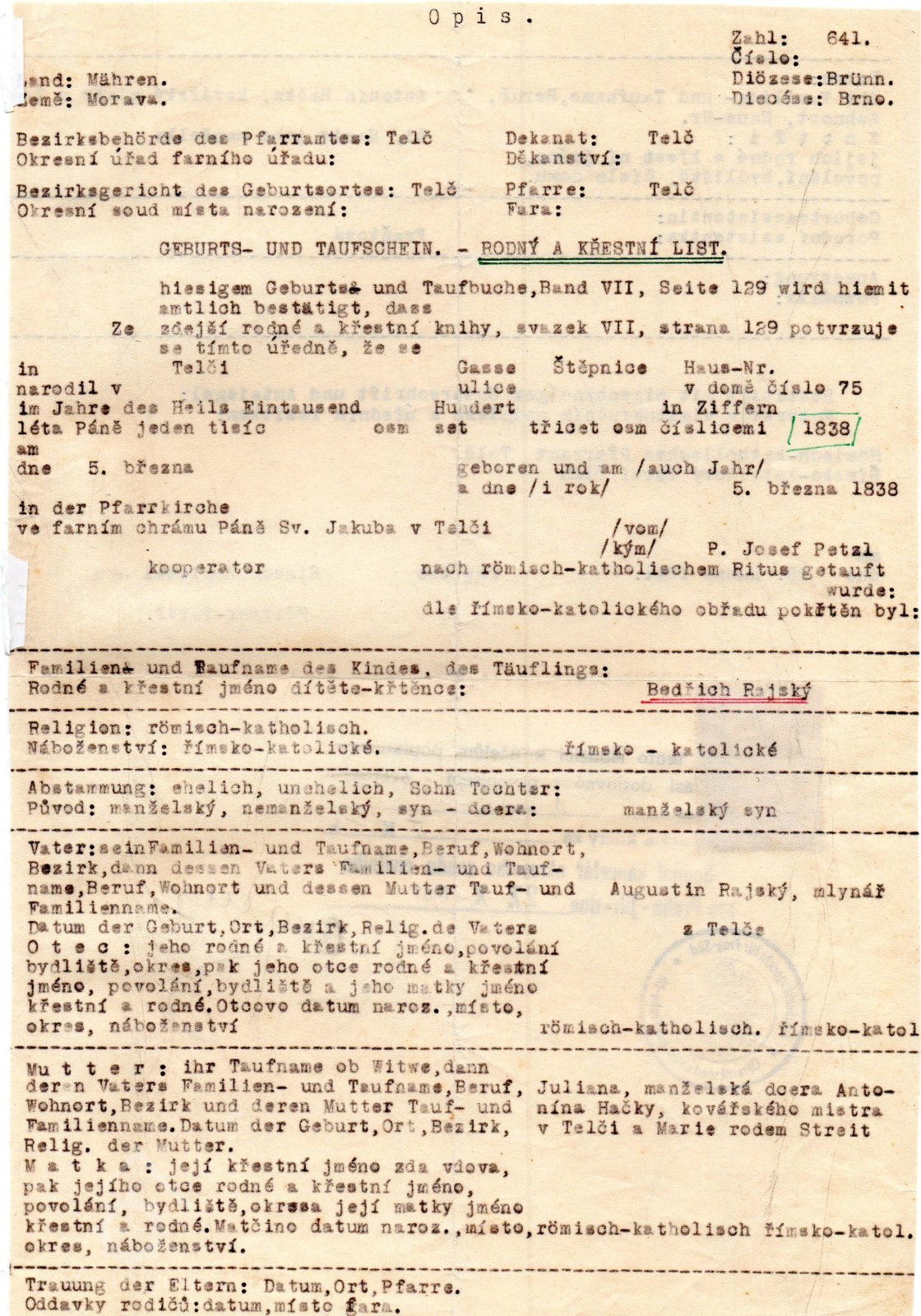 Dle opisu rodného a křestního listu z 5.3. 1838, pořízeného v roce 1941 je uveden RAJSKÝ AUGUSTIN - mlynář v Telči, otcem Bedřicha Rajského, který byl otcem nevidomého hudebníka a kapelníka Stanislava Rajského, osobnosti Telče.