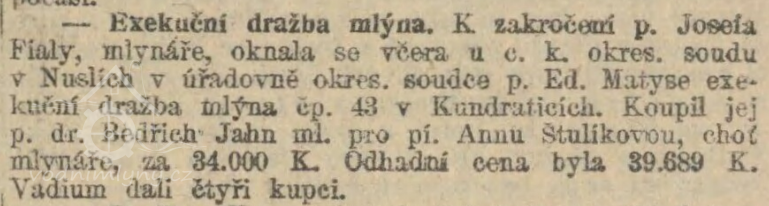 30.4.1808 Jan Sýkora prodal mlýn Antonínu Gürtlovi s manž. Annou za 9000 zl.