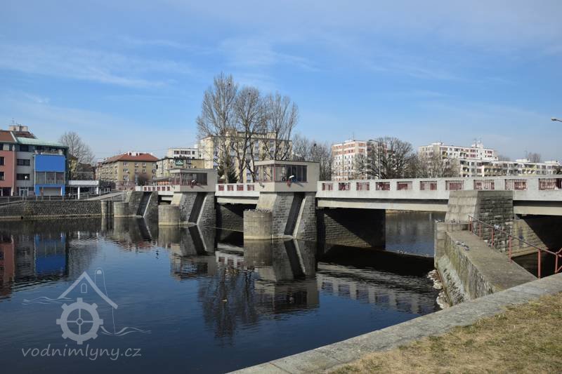 Pod mostem na jeho jižní straně se nachází válcový jez se třemi jezovými poli. Těleso válce je z ocelové nýtované konstrukce z válcovaných profilů a plechů. Válec se ovládán jednostranně z pravé strany Gallovými řetězy. Zvedací mechanismus je na ruční i elektrický pohon. V levém poli jezu je propust a v pravém poli náhon s česly a dále obdélná stupňovitá stavba malé vodní elektrárny (MVE) s plochou střechou, na fasádách s pravidelně rozmístěnými úzkými okny a vjezdovými otvory s vraty.