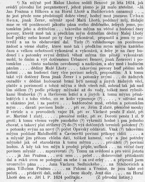 1. Když ještě žil staříček nynějšího pana Beny, ten uměl čarovat a přihodilo se mu toto: Jednou přišli do mlýna loupežníci a poručili si jíst a pít. Pan Bena jim dal, co chtěli. Když pojedli, chtěli peníze. Pan Bena jim přinesl slaminku peněz, ale jak odešli, pravil: „ Však já jim osvítím“. Odklínoval mlýnské kolo a pustil je za nimi. Kolo jelo, a když přijelo k loupežníkům, všechny je rozmačkalo. Potom se vrátilo a mělo na každé lopatě peníze.