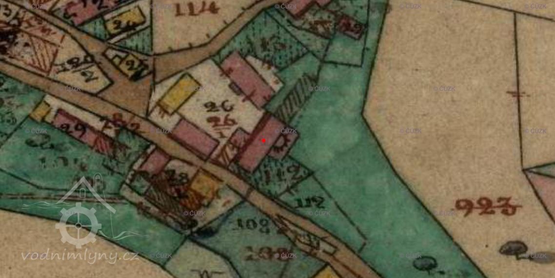 V roce 1930 byl majitelem mlýna a pily František Veit. V "Seznamu vodních děl Republiky Československé" je jako vodní tok uveden Tlučenský potok. Tlučenský potok teče hluboko pod mlýnem a v kolmém směru na zbytek vodního díly u mlýna. Mlýn byl napojen dlouhým náhonem (cca 1 km) z potoka Rytina. Současný vodní tok náhonu se odklání od původního směru cca 300 m nad mlýnem. Náhon ke mlýnu byl zrušen.