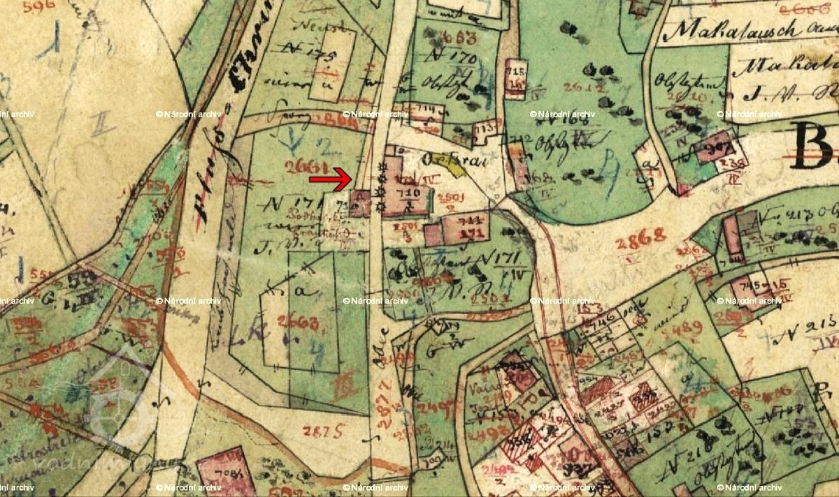 1746 obec prodává mlýn "se zahradou až k Červené studánce a orným ostrůvkem mezi vodou a spalvem pod Blechovským mlýnem, s roštinami okolo vidy a pod kopcem a planými hruškami".