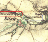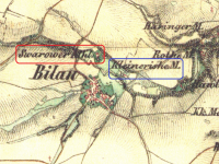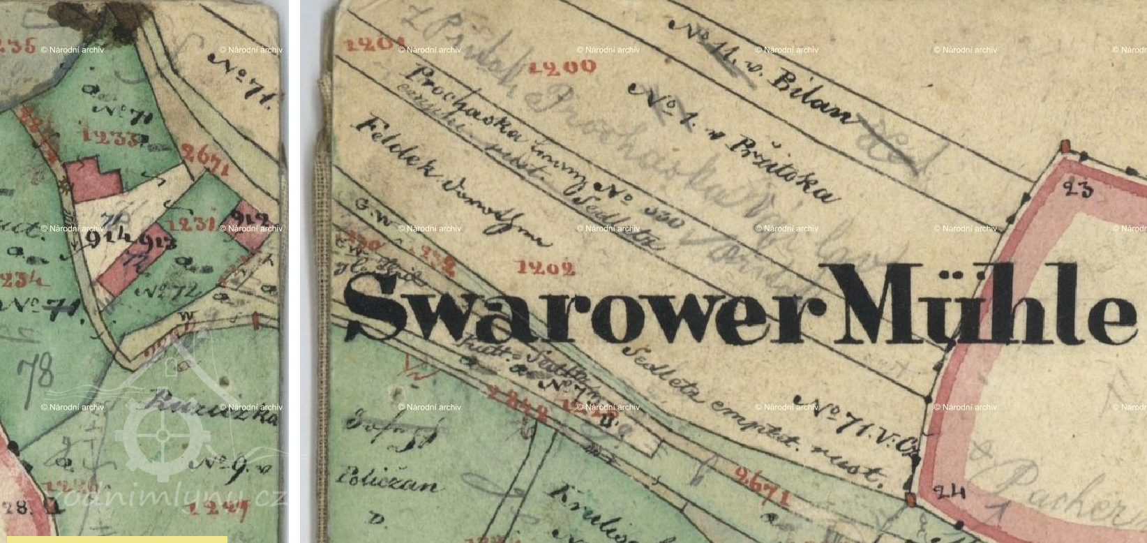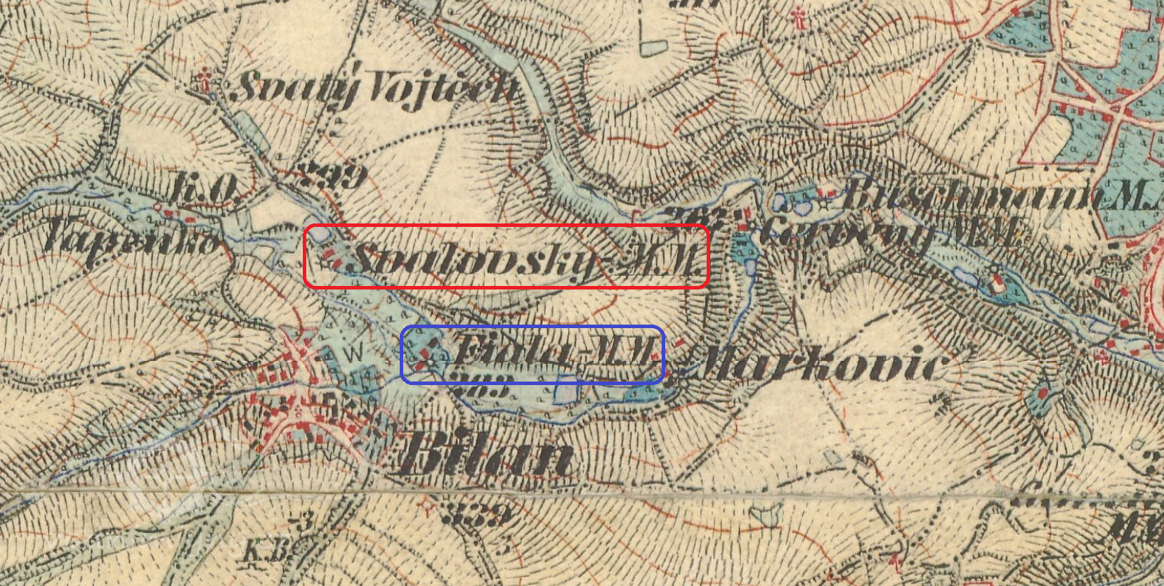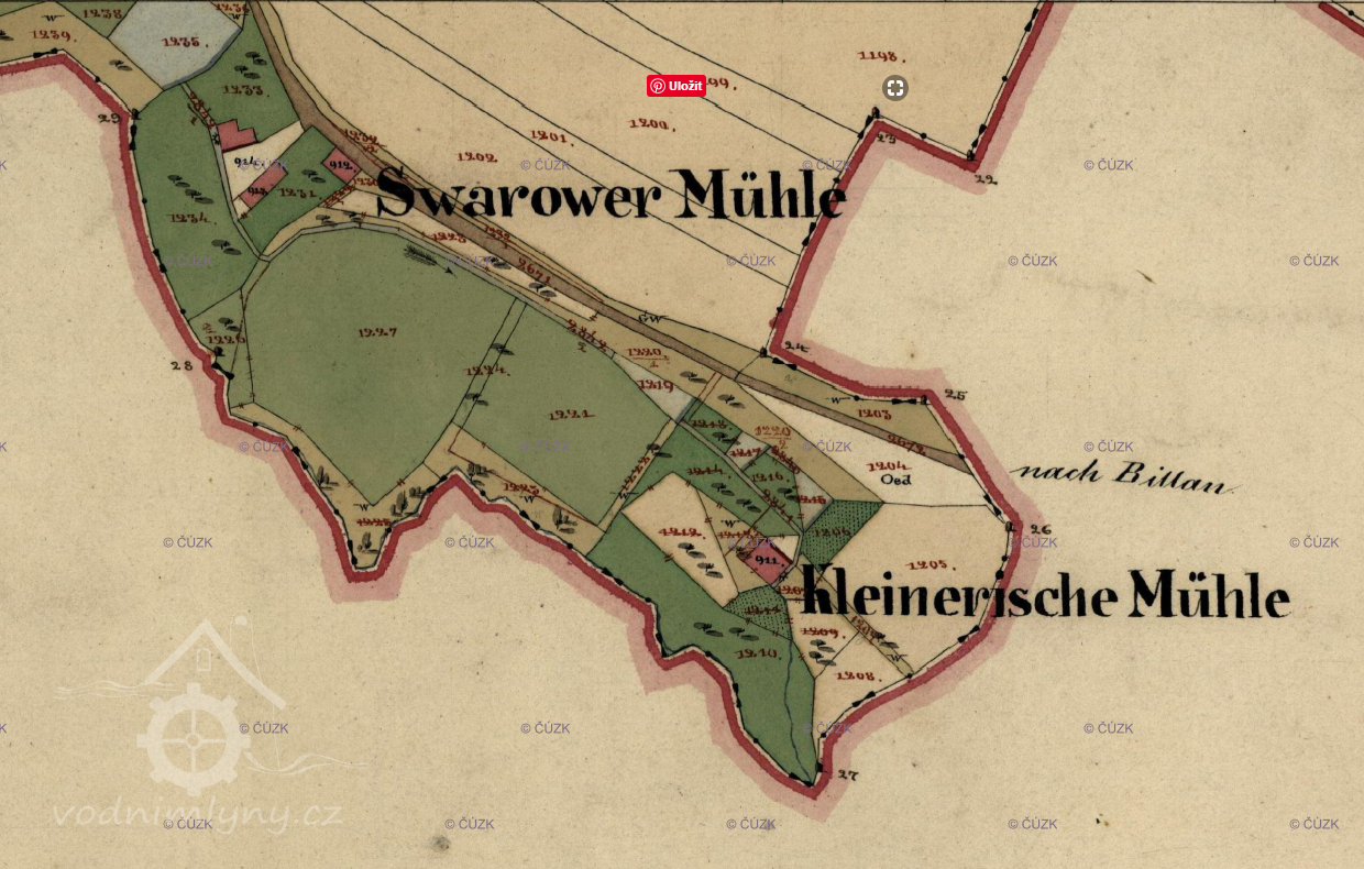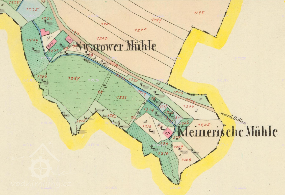 Svárovský (červeně) a Kleinerův (modře) mlýn, II. vojenské mapování, výřez, 1836-1852, © oldmaps.geolab.cz