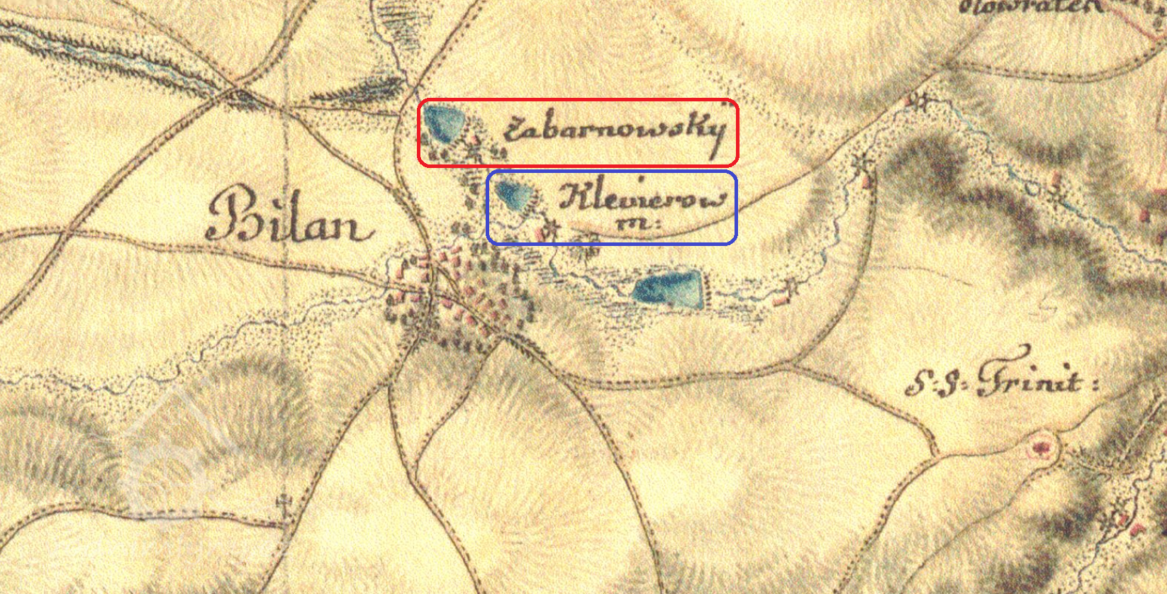 Svárovský (červeně) a Kleinerův (modře) mlýn, I. vojenské mapování, výřez, 1764-1768, © oldmaps.geolab.cz