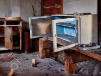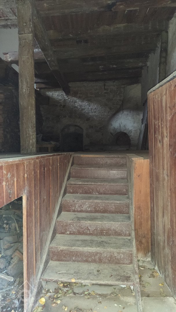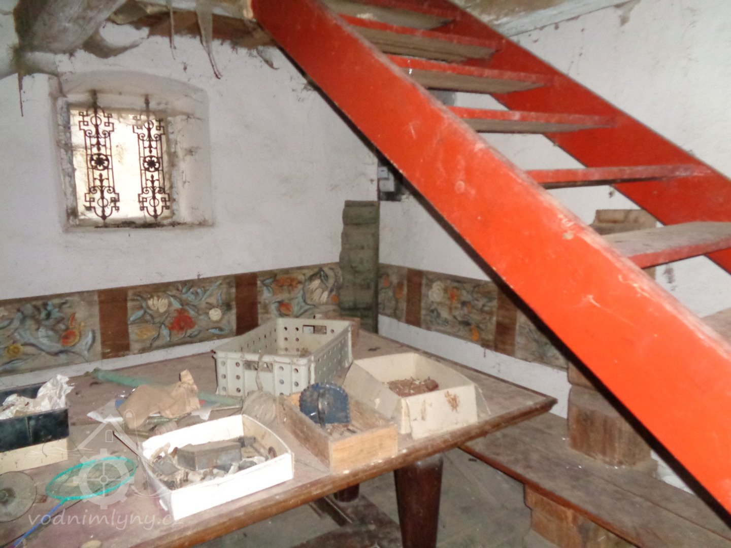 Schody do patra, dole prkna z rozebraného malovaného strropu, 11 2020, © Radovan Křížek, (Prvky na obrázku: trámový strop, schodiště, umělecké prvky (sochy, malby, reliéfy))