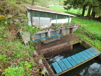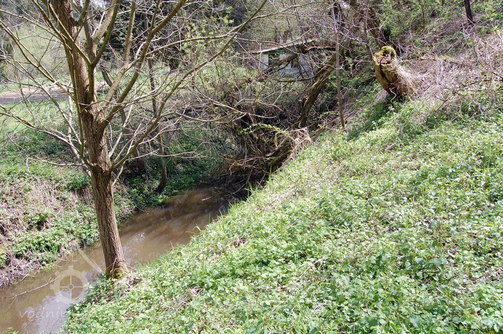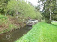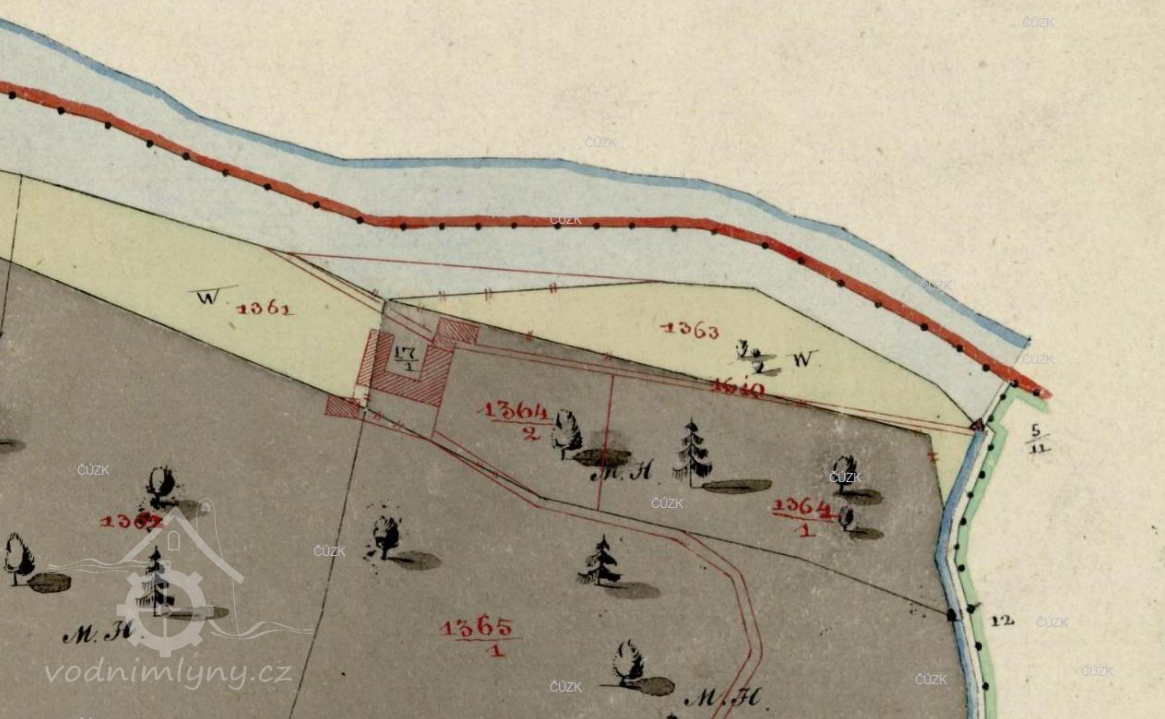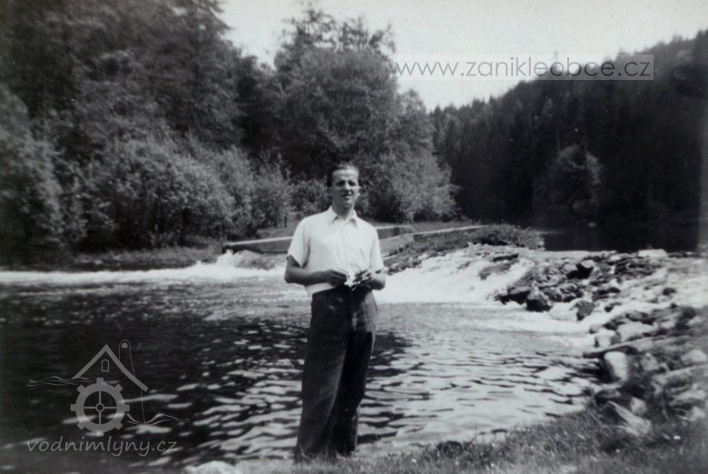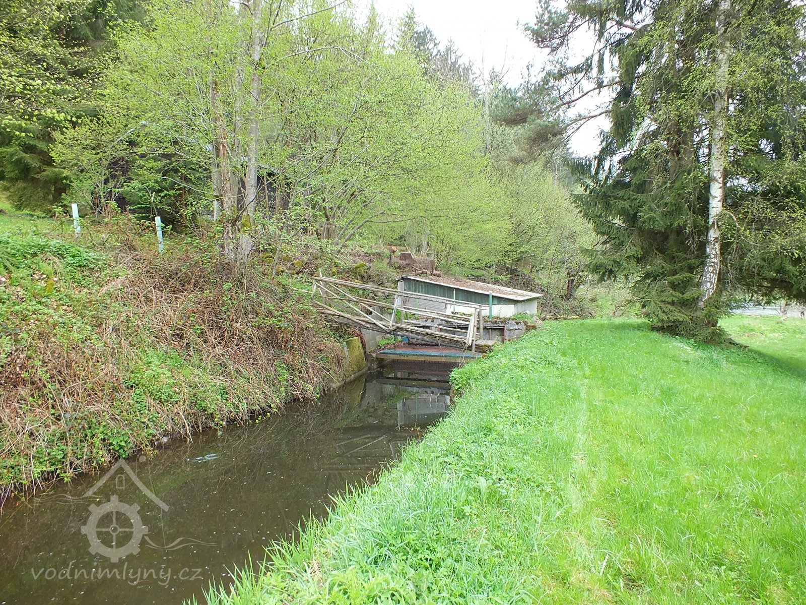 Patrné základy novějšího velkého mlýna, odstřelen 1963, zachovaný turbínový domek možná s funkční elektrárnou.