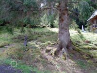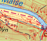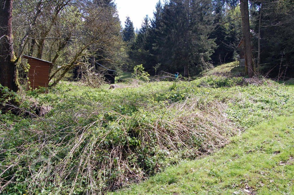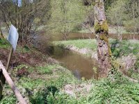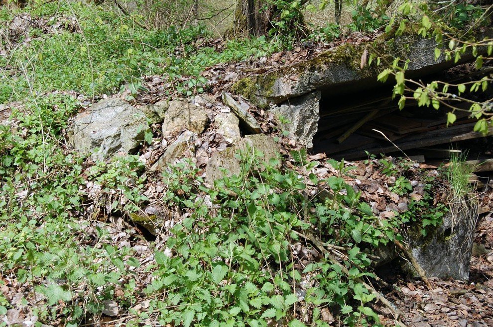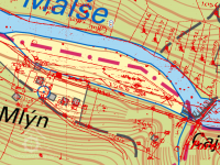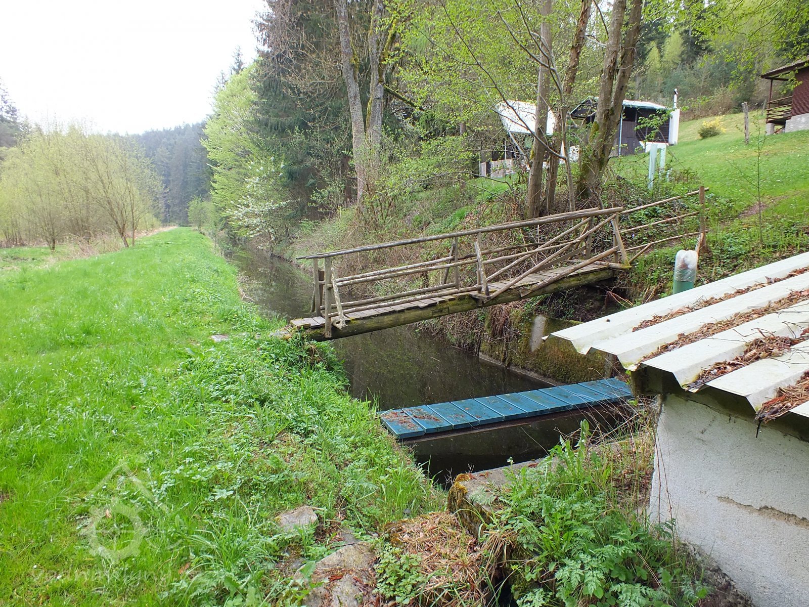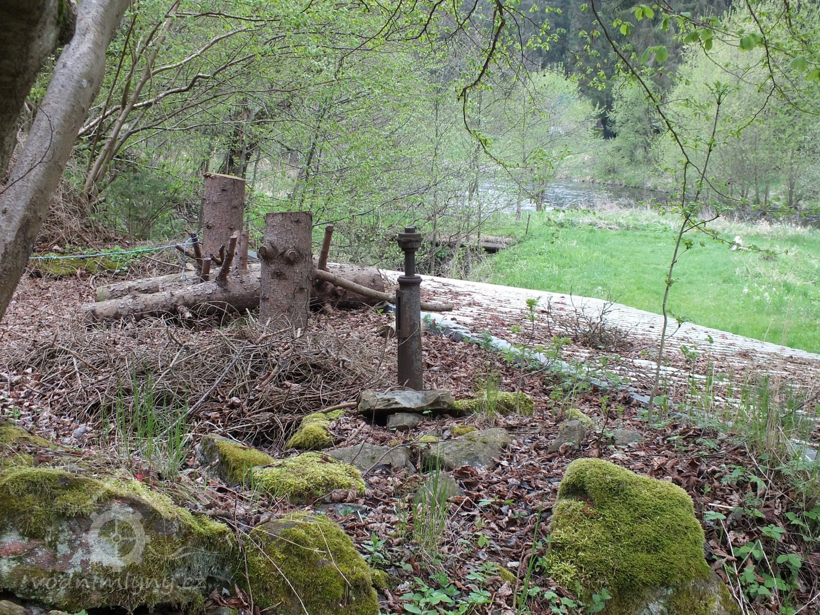 Patrné základy novějšího velkého mlýna, odstřelen 1963, zachovaný turbínový domek možná s funkční elektrárnou.