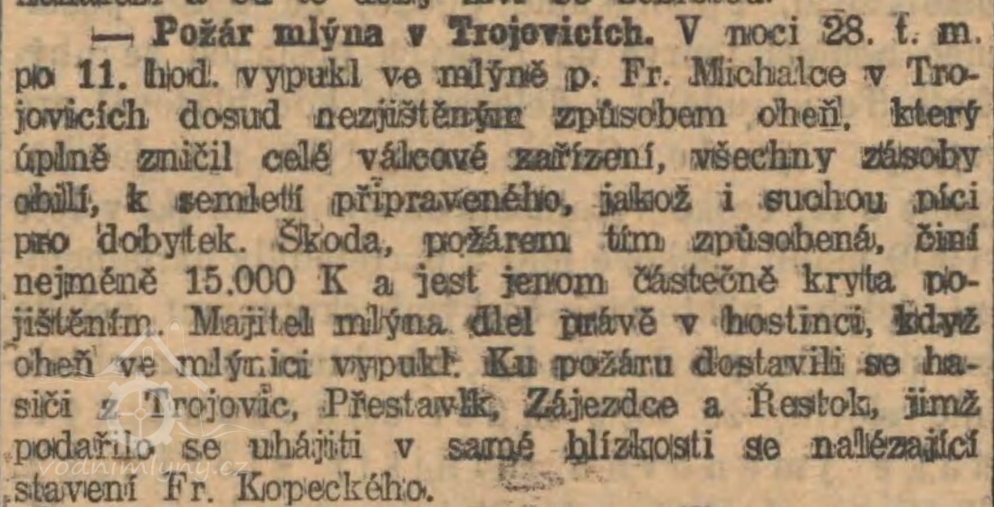 28. března 1911 mlýn vyhořel, za majitele Františka Michalce. (RR)