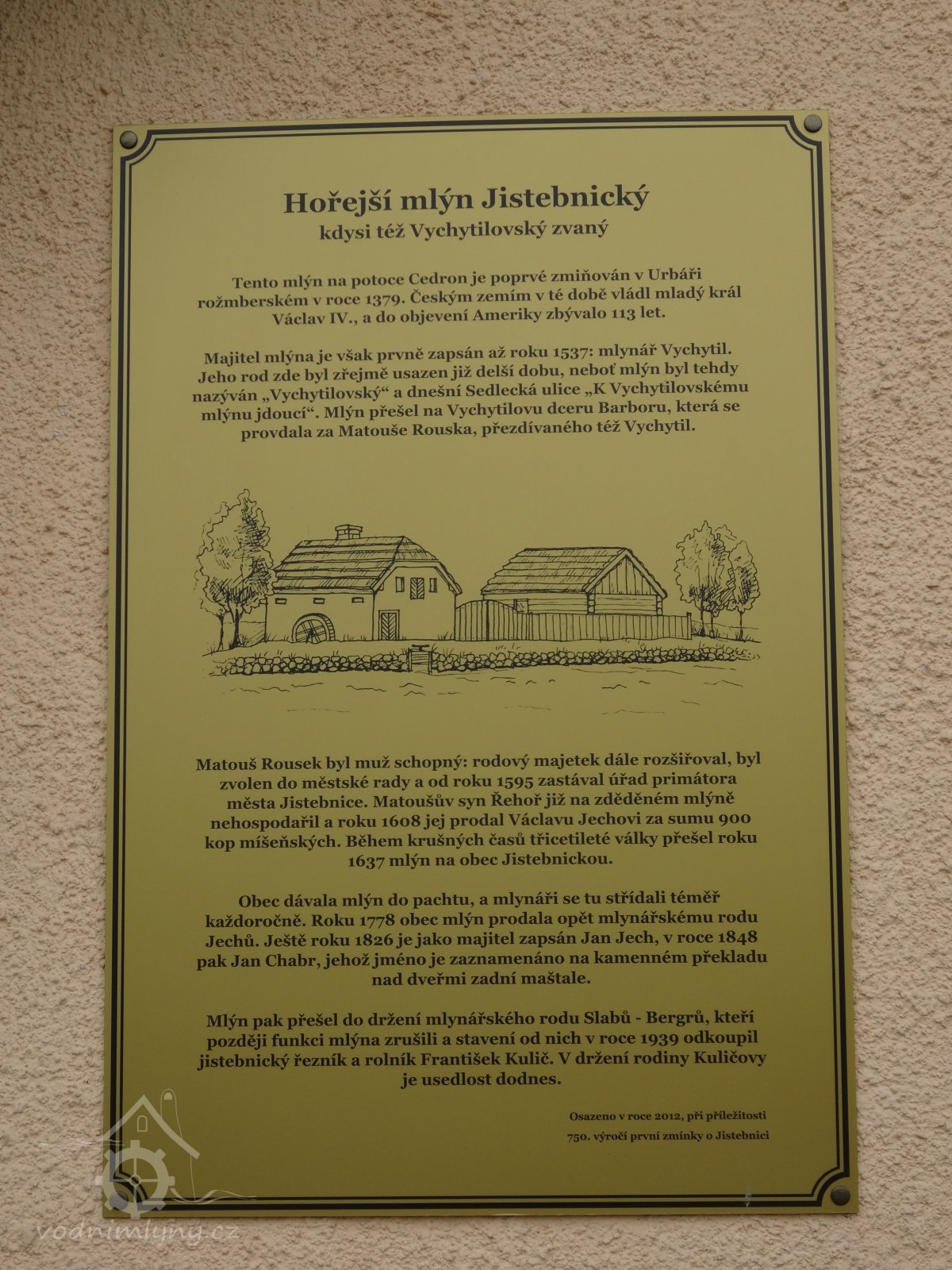 Mlýn „Selského družstva mlýnského a pekárenského v Jistebnici“. R. 1545 patřil mlýn tento zvaný po předešlém držiteli „Vychytilovský“ Matouši Rouskovi zvanému po mlýně též Vychytil. Tento učinil v sobotu na den sv. Vavřince L.P. 1555 přátelskou smlouvu se svým švagrem Pavlem, mlynářem v Sedlčanech o spravedlnost náležící jemu na tom mlýně a odkázanou jemu od mateře jeho ženy v sumě 50 kop míšeňských v ten způsob, že Matouš zaplatí 10 kop míšeňských při sv. Václavě r. 1556 a zbytek ve splátkách po 5 kopách až do zaplacení. Dluh splatil Matouš Rousek r. 1563 úplně. Kniha grunt. I. fol. 34.