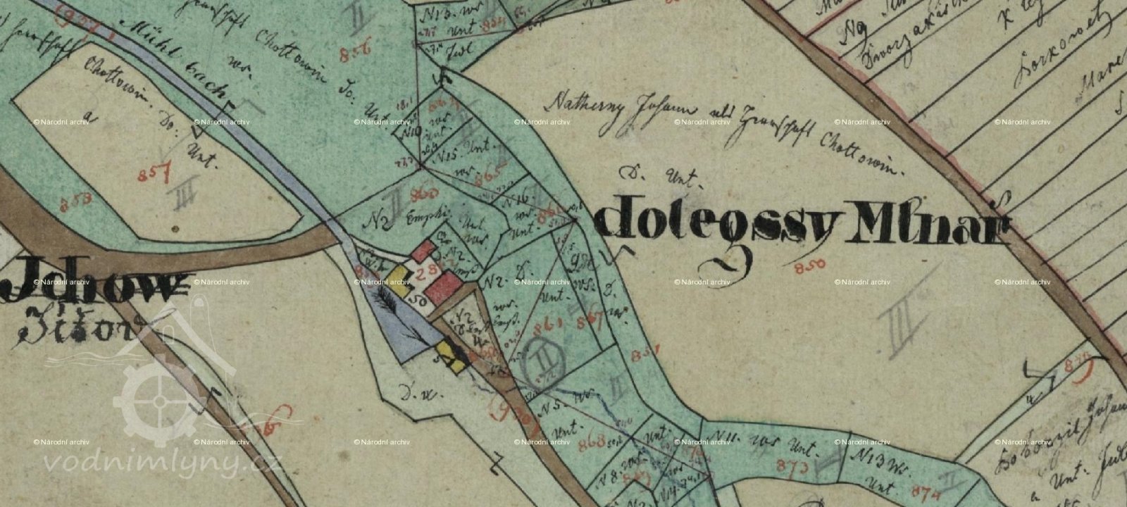 (Původní čís. 2 byla myslivna panská.) Čís. 3 (nově čp. 2) dolní mlýn, na němž byl (1781) mlynář Skřivánek. Později držel mlýn s 9 j. 753 s. polí a 1 j. 406 s. neb 3 ½ fůry sena luk a 2 m. pastvišť František Zeman a prodal jej r. 1796 Josefu Prchlíkovi za 1700 fl. Po něm držel mlýn syn Jan a pak Josef Prchlík, od r. 1858 Václav a Kateřina Žahourovi, od r. 1887 syn Václav s manžel. Petronilou. R. 1914 koupili mlýn František a Anna Šeborovi. Po smrti Františka Šebora (1917) dědil syn František a v dražbě r. 1923 koupil Frant. Vávra. Polovina matčina připadla dceři Julii, provdané Hrubcové. Mlýn koupili v dražbě r. 1925 Antonín a Josefa Samcovi...