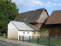 Patrový mlýn se zděným přístavkem z r. 1938, stodola 1539, na křížovém půdoryse.