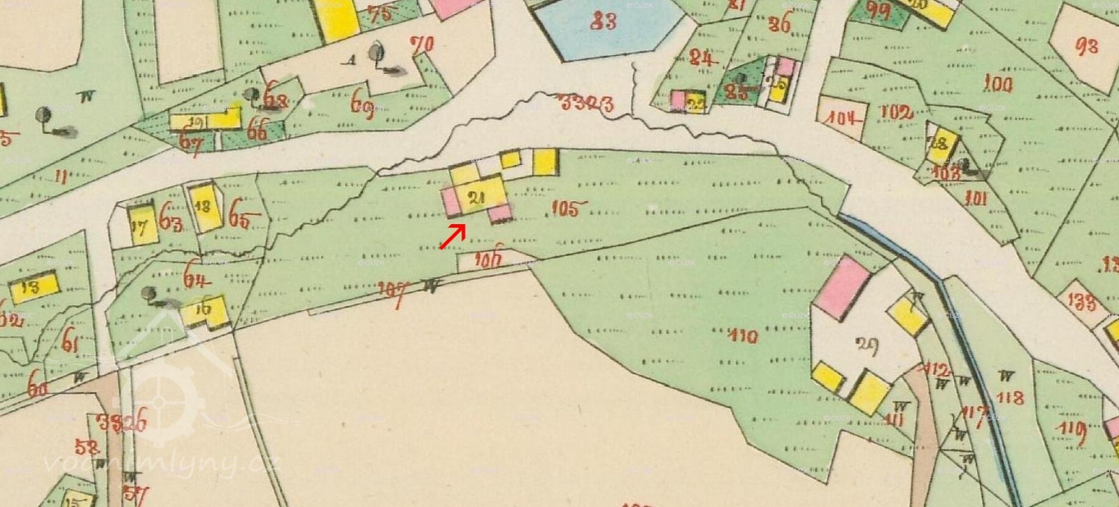 Roubené jednopatrové budova, v přízemí obytné světnice 3, v patře mlýnice dnes vybavena dvěma válcovými stolicemi. Původní mlýn 3 mlýnskými kameny zrušen r. 1942 a celé patro přestavěno. Původní zůstaly čelní a pravá strana. Zařízení mlýna slouží od r. 1953 JZD jako šrotovna. Na levé straně nový patrový přístavek výměnku. Na pravé straně stranou vchodu přístavek, přízemní budova sloužící jako chlévek a komora. Vzadu stodola. Stropy v patrové části roubeného stavení dřevěné (trámy, prkna ).