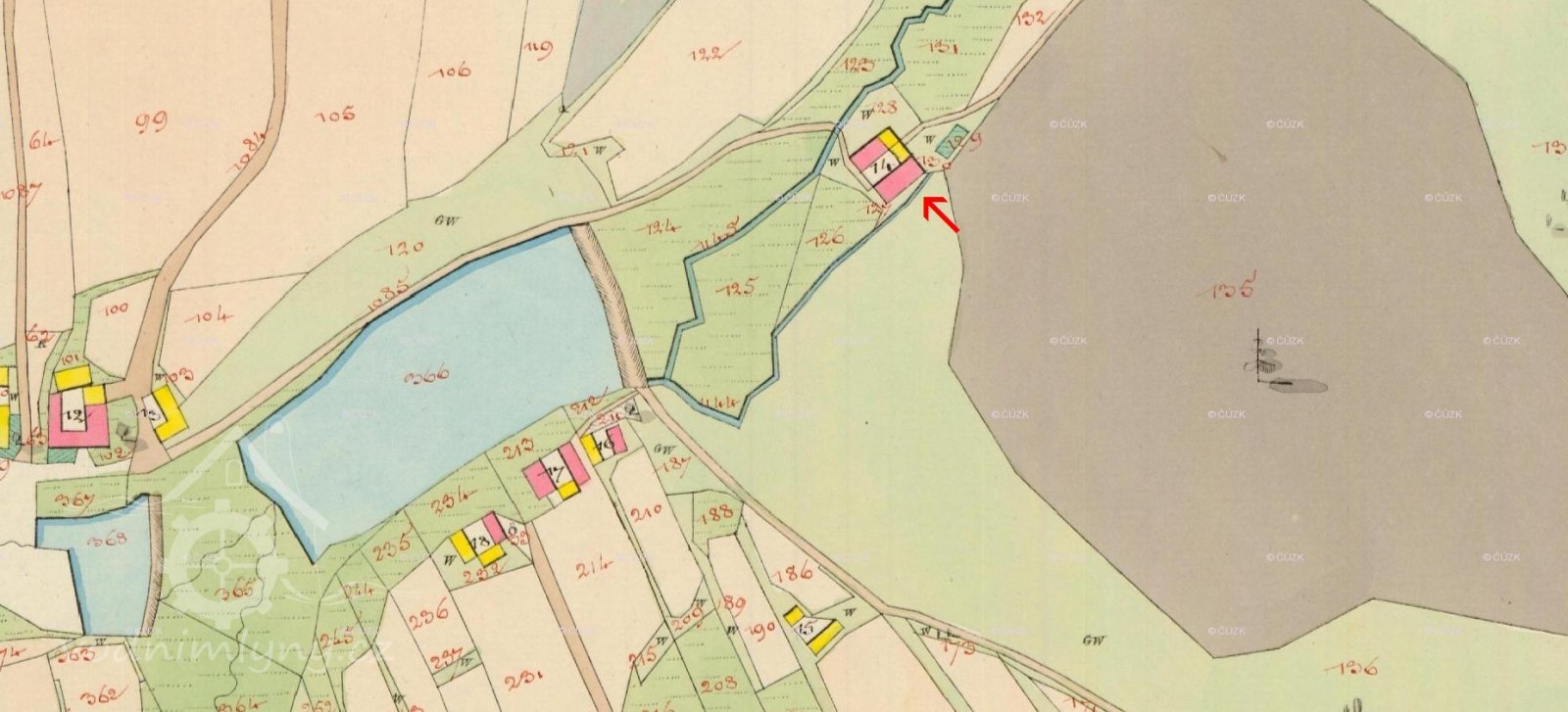V hrázi obecního rybníka blíže splavu zasazen 19.9.1894 jako pevný bod kamenný sloup v délce 1,3 m a průřezu 0,25/0,25 m. Hlava železného hřebu do hoření plochy sloupu zaraženého značí niveu pevného bodu... Při mlýnu zasazena byla železná kramle na jihovýchodní straně budovy mlýnské, jejíž hoření hrana leží v niveu obyčejné výšky vody u mlýna...