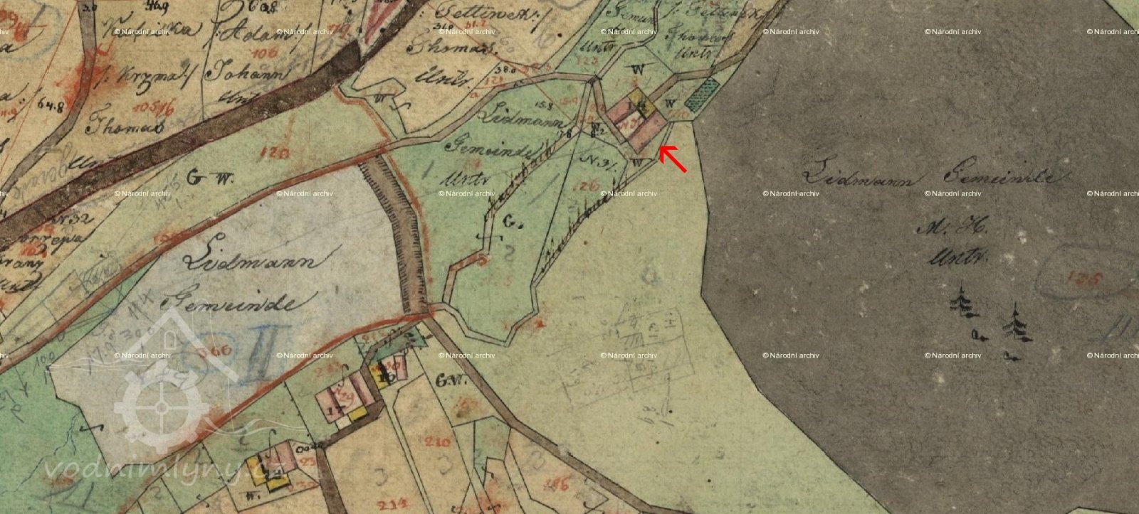 Voda přivádí se z velkého obecního rybníku náležícího obci Lidmani mlýnskou stokou, jež u mlýna končí ve vantroky, které mají délku 4,6 m, šířku 0,77 m a výšku 0.34 m, žlab vedoucí vodu na kolo měří 2,4 m. Stavítko ve žlabu má 0,35 m šířky a 0,28 m výšky.
