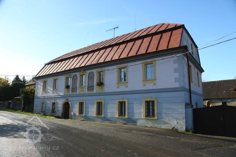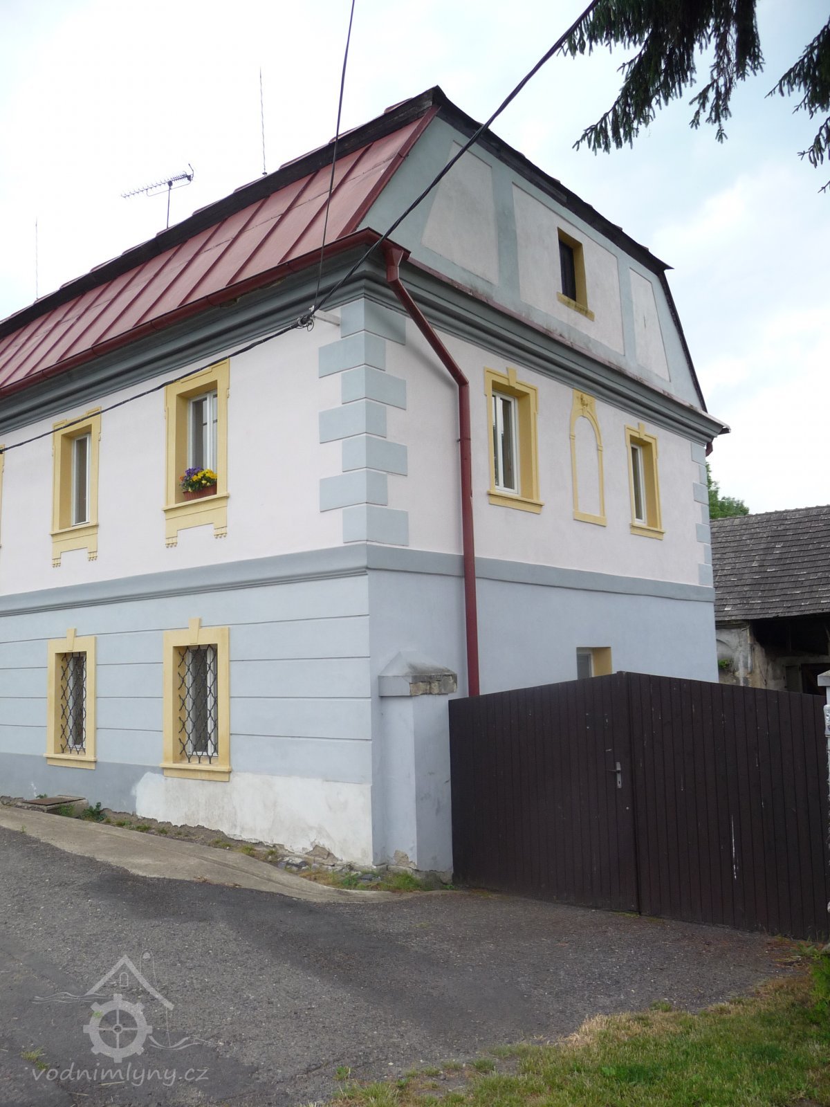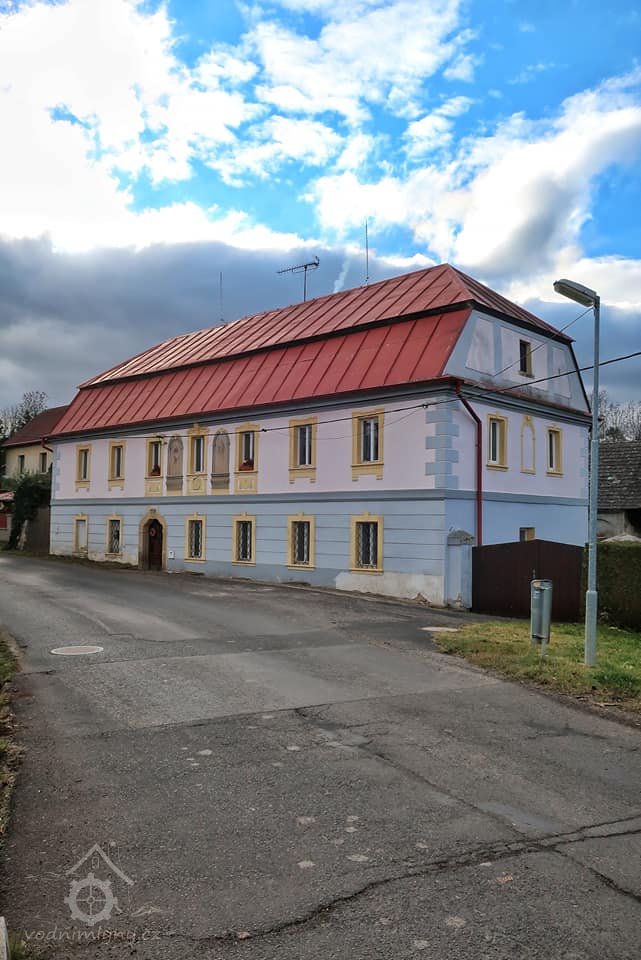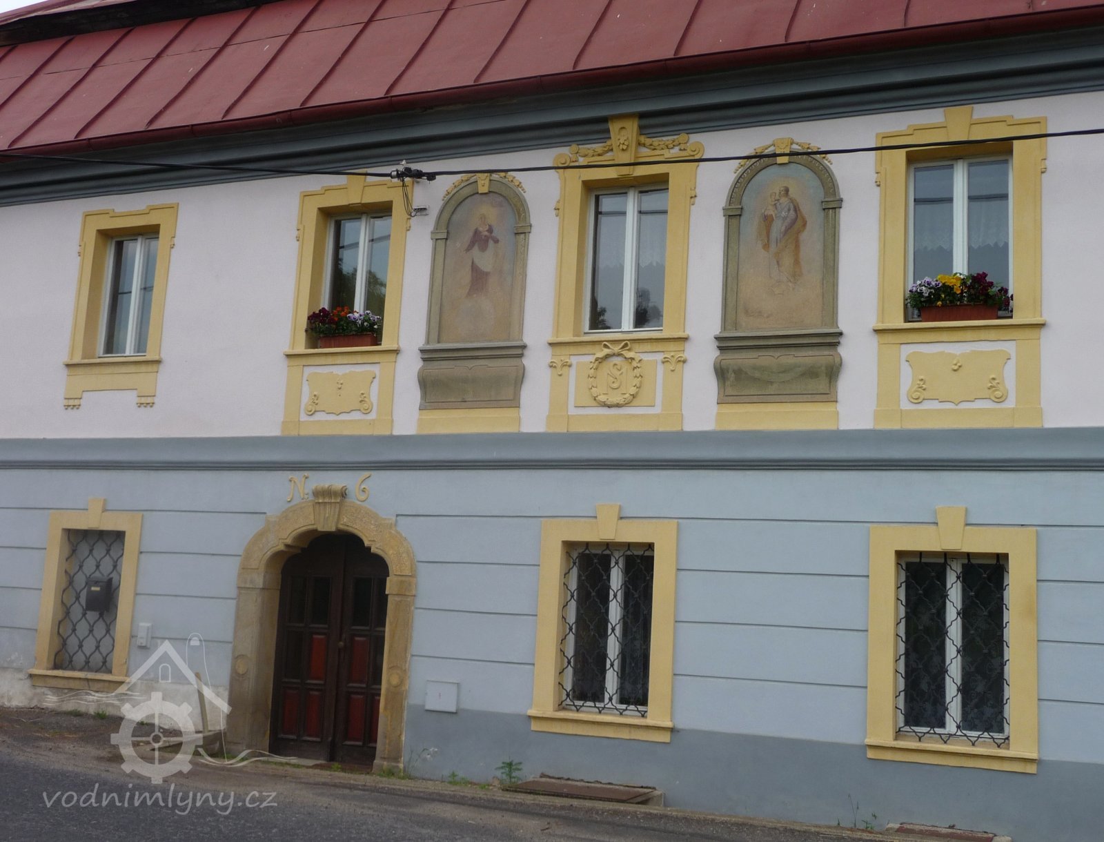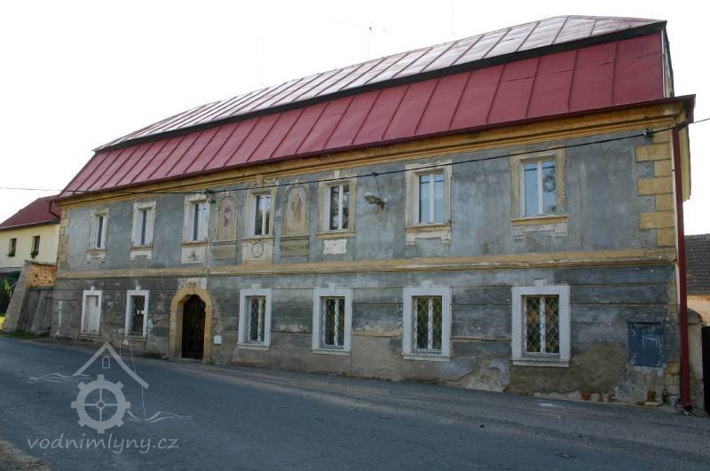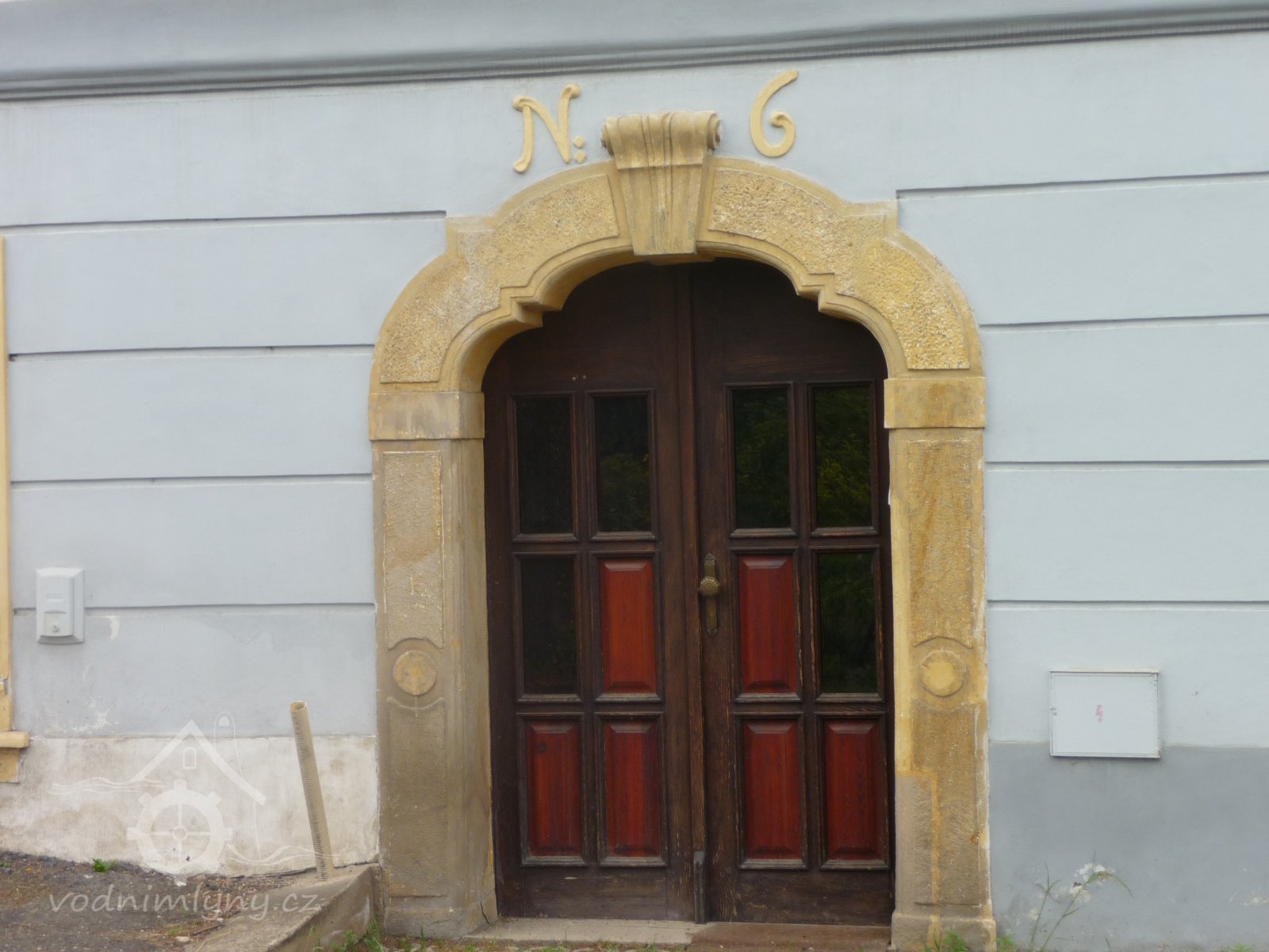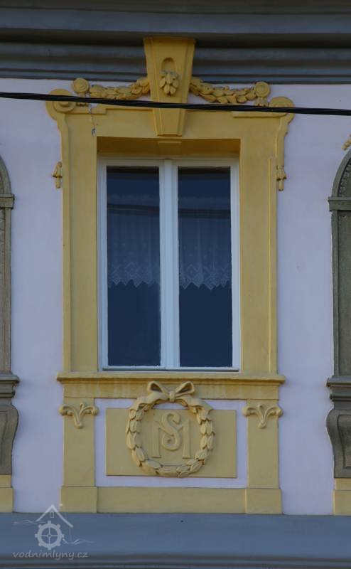 Vchod do mlýna, 11 2022, © Kateřina Neumannová, (Prvky na obrázku: dveře, epigrafické památky (nápisy, datování aj.), plastická omítková výzdoba fasád a štítů)