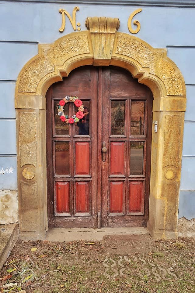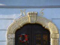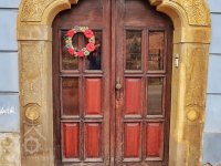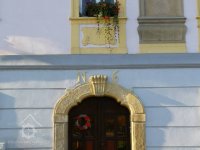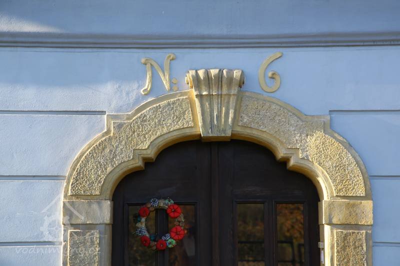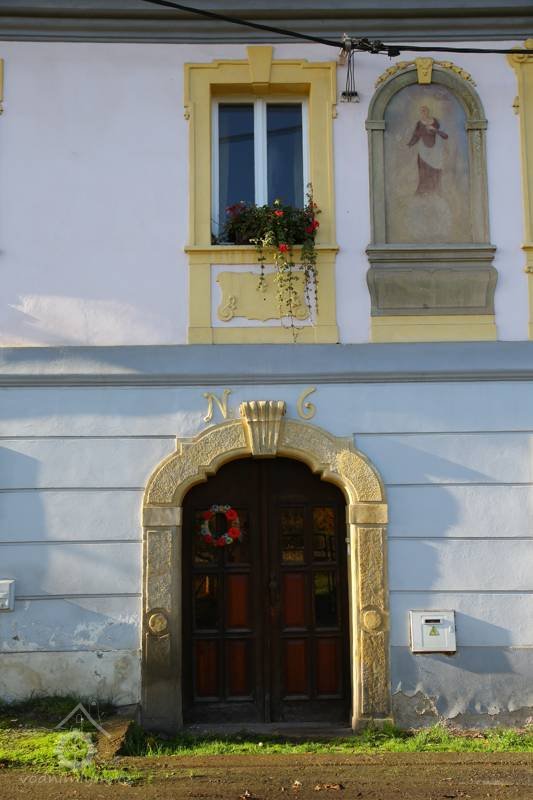 Dveře, plastická výzdoba, číslo na domě, 2015, © Helena Špůrová, (Prvky na obrázku: dveře, epigrafické památky (nápisy, datování aj.), plastická omítková výzdoba fasád a štítů, kamenické prvky barokní a mladší)