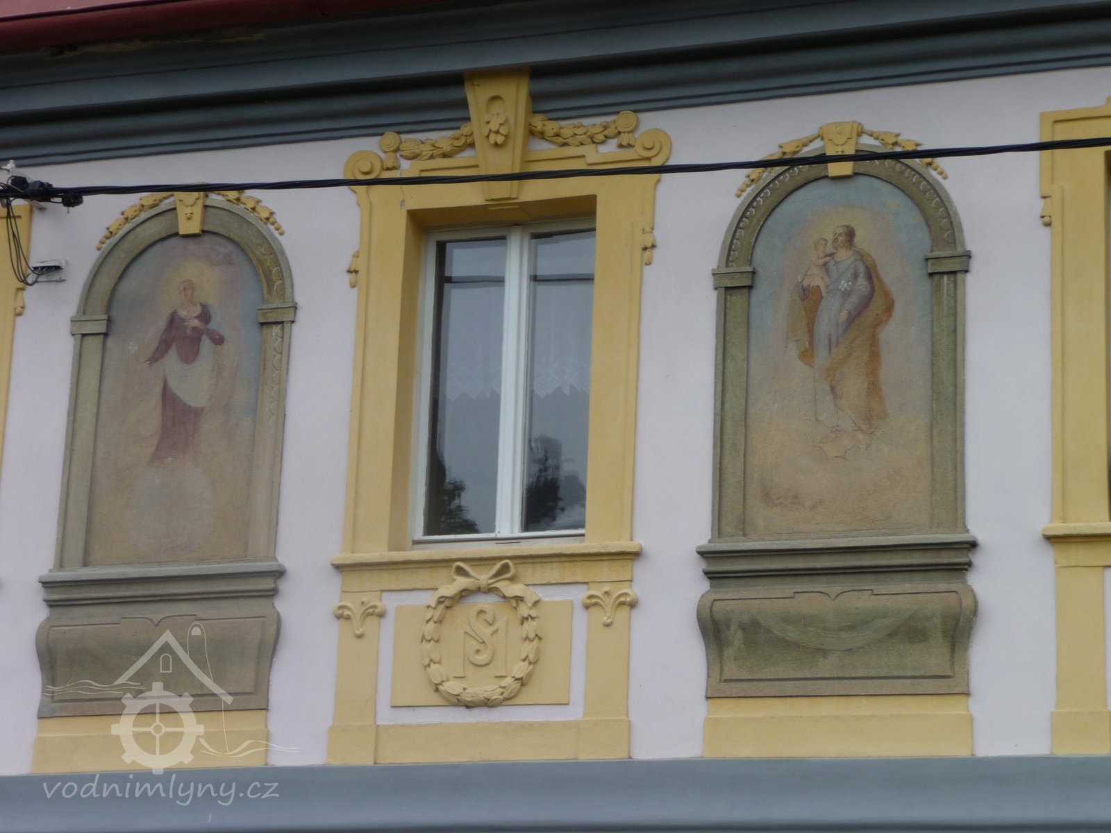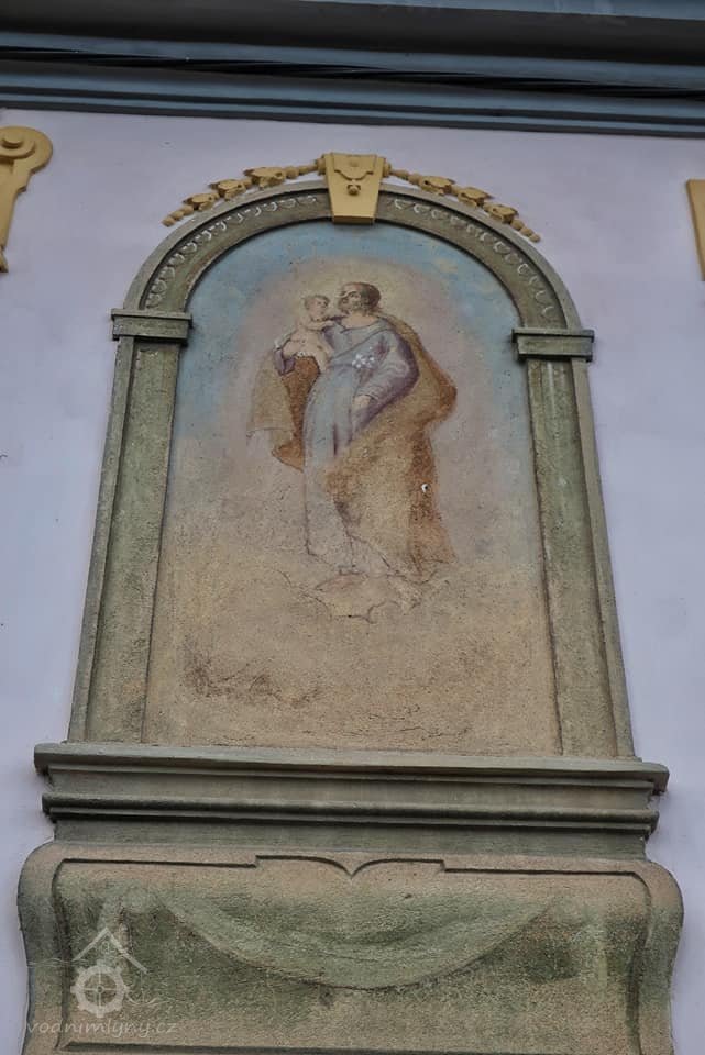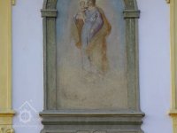 Obraz na vstupním průčelí, 11 2022, © Kateřina Neumannová, (Prvky na obrázku: plastická omítková výzdoba fasád a štítů, malovaná výzdoba fasád a štítů, umělecké prvky (sochy, malby, reliéfy))