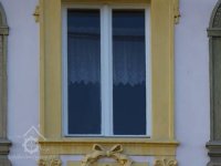 Okno, 11 2022, © Kateřina Neumannová, (Prvky na obrázku: okno, plastická omítková výzdoba fasád a štítů)