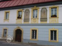 Plastická omítka,,okna, dveře, malby, 2015, © Helena Špůrová, (Prvky na obrázku: dveře, okno, plastická omítková výzdoba fasád a štítů, malovaná výzdoba fasád a štítů, umělecké prvky (sochy, malby, reliéfy))