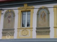 Okno, obrazy svatých na fasádě,,plastická fasáda, 2015, © Helena Špůrová, (Prvky na obrázku: okno, epigrafické památky (nápisy, datování aj.), plastická omítková výzdoba fasád a štítů, malovaná výzdoba fasád a štítů, umělecké prvky (sochy, malby, reliéfy))