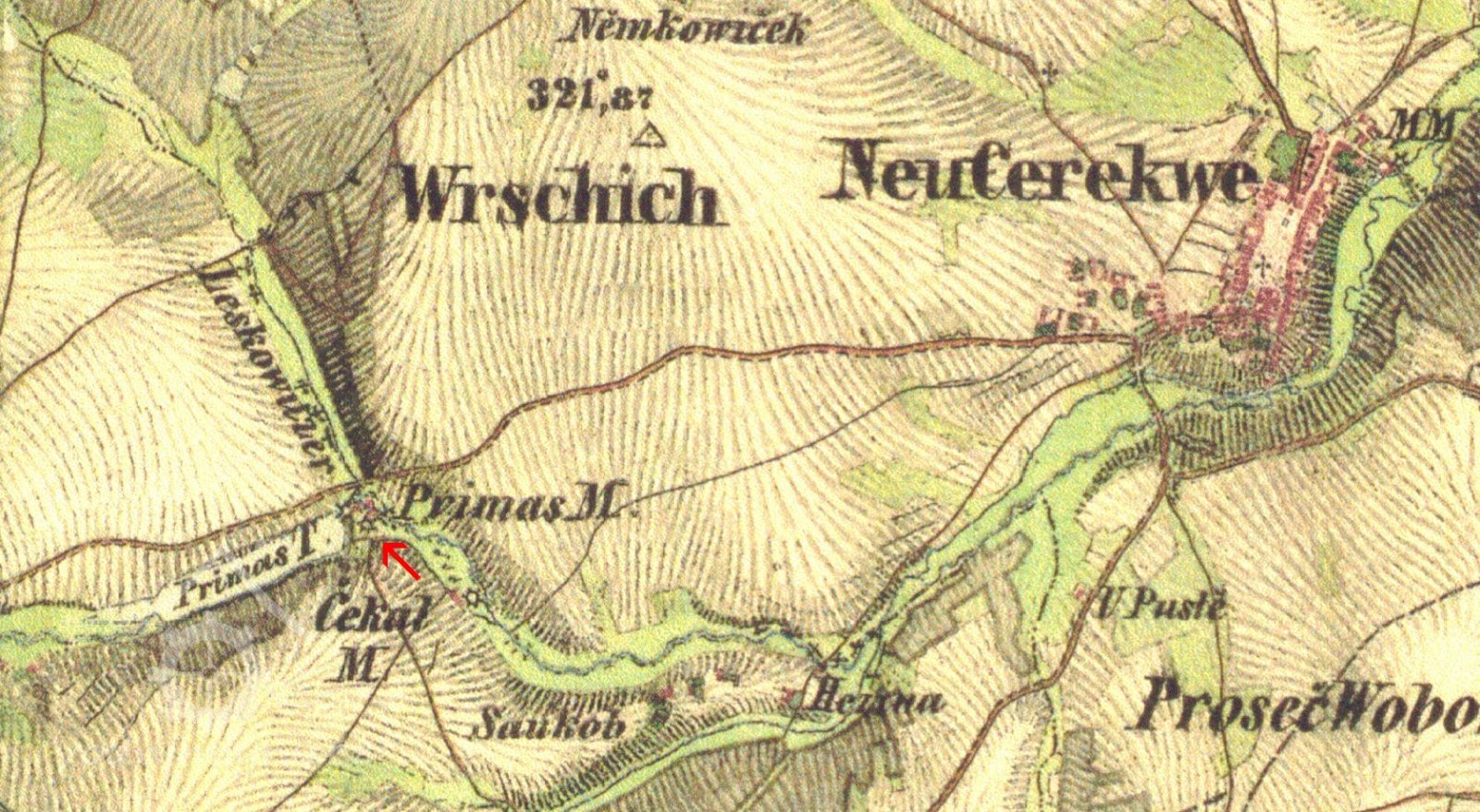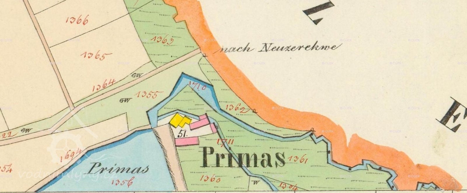 Uzavřený komplex budov pod hrází Primusovského rybníka. Konec mletí na mlýně způsobila povodeň v roce 1949, která způsobila takové škody, že již mlýnské zařízení opraveno nebylo.
