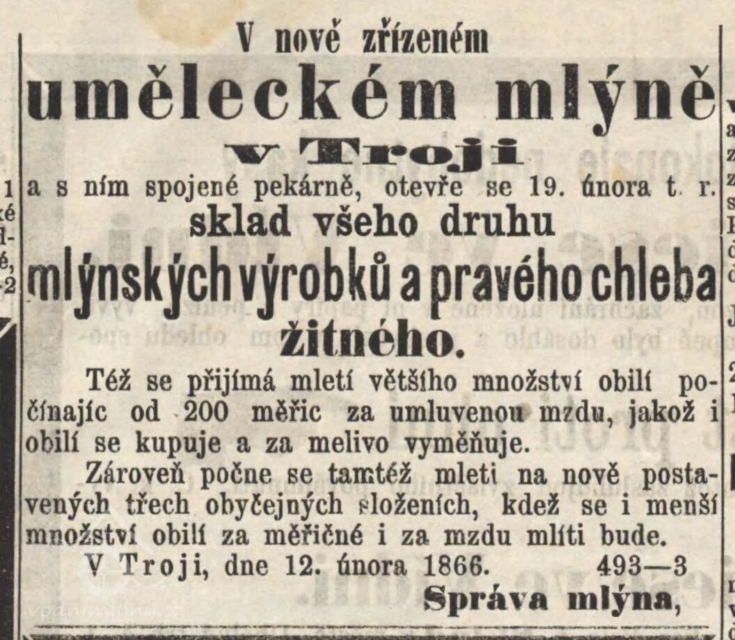 Trojský mlýn je starého založení (před 17. století), zřejmě podstatně staršího než zámecký areál, v jehož jihozápadním sousedství se nalézá.
