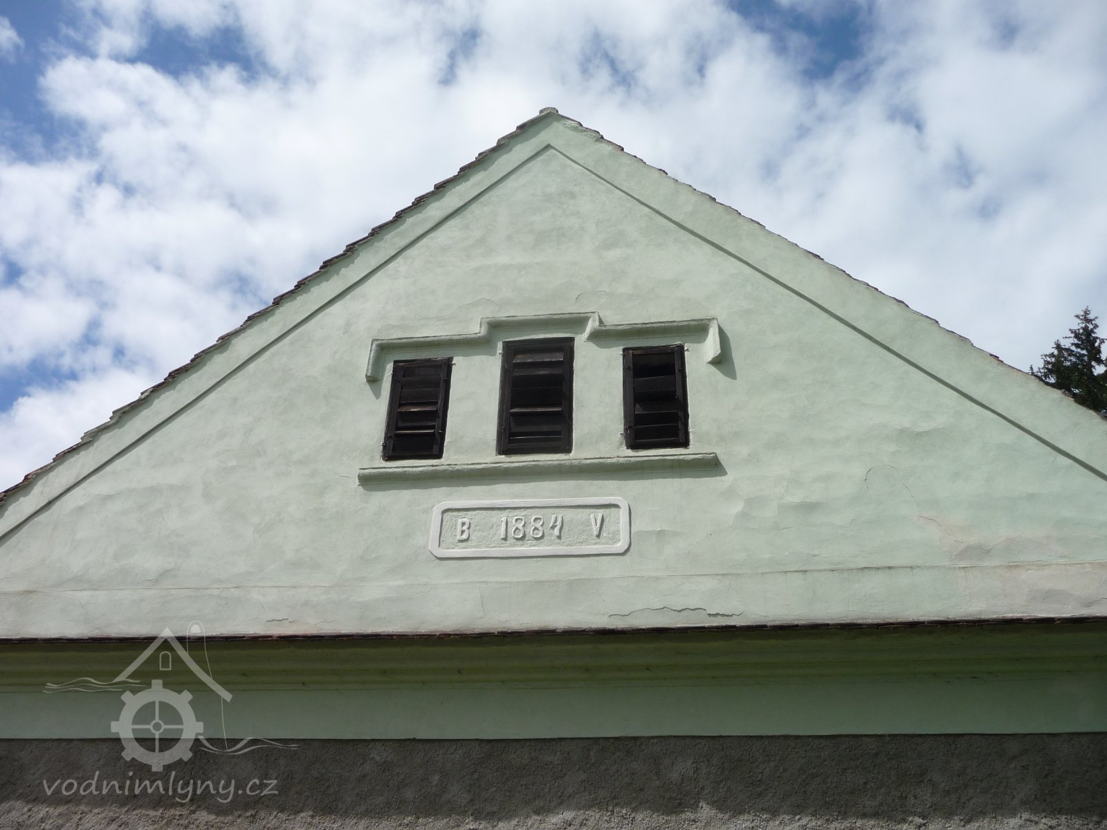 Okna a nápis na štítě mlýnice - detail, 2015, © Helena Špůrová, (Prvky na obrázku: okno, epigrafické památky (nápisy, datování aj.))