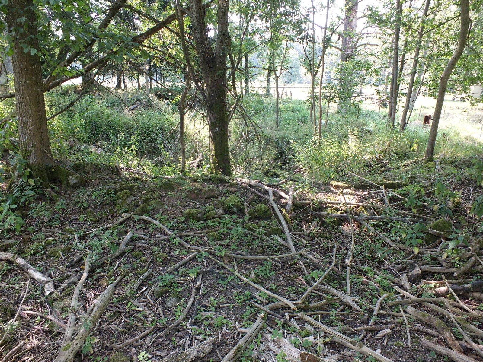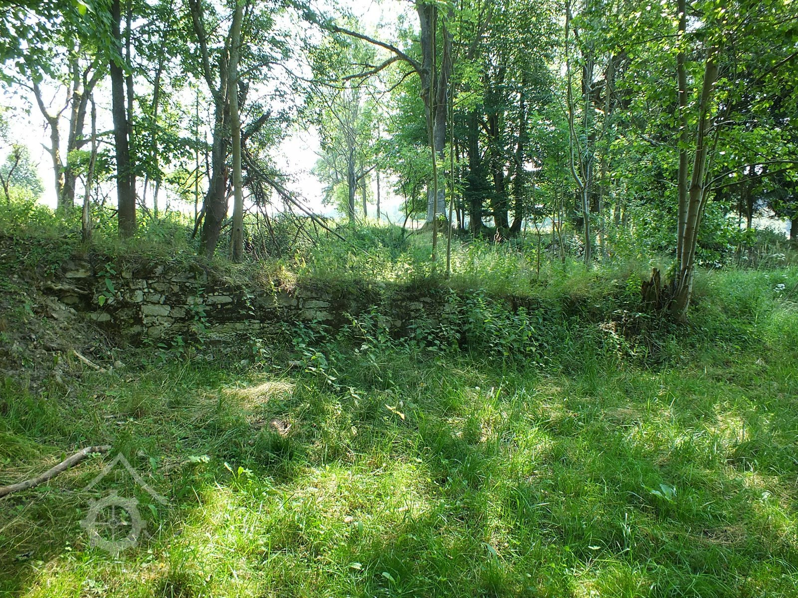 Zaniklý mlýn se zbytky zdiva v terénu.