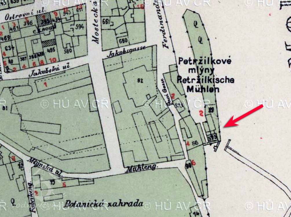 Již ve 40. letech 14. stol. stávaly na tzv. Petržilkovském ostrově mlýny zvané kartouzské, patřící kartuziánskému klášteru na Smíchově. Ty však byly r. 1419 vydrancovány a vypáleny husity spolu s klášterem. Po husitských válkách získala ostrov pražská obec