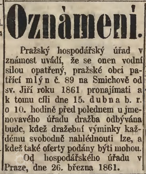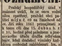 1861 - inzerát na pronájem mlýna čp. 89 (RR)