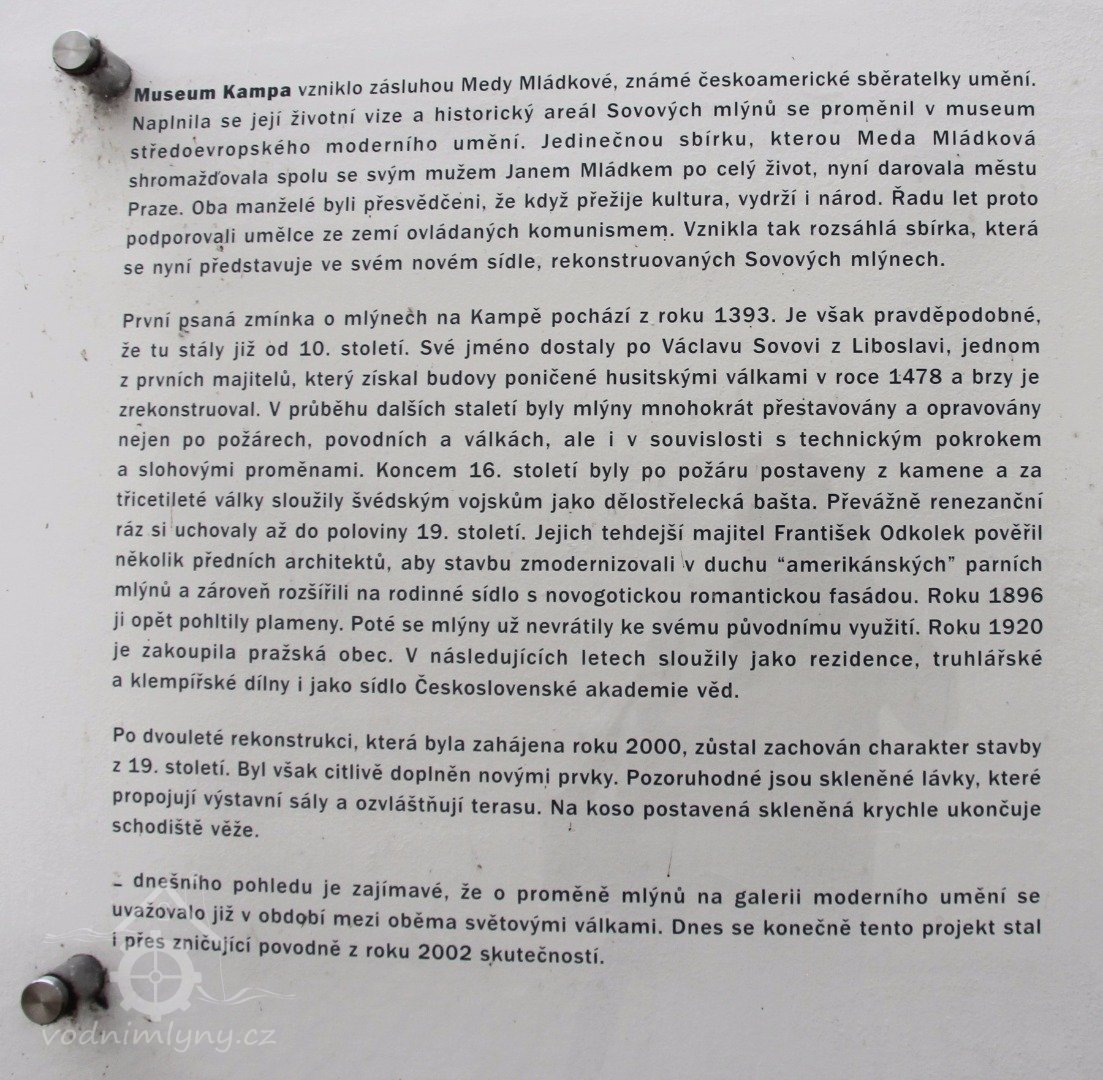 Pozdější zprávy o Sovových mlýnech se datují z r. 1675 u příležitosti, kdy rada Menšího Města Pražského žádala Staroměstské, aby jí postoupili „mlejny Sovovské s oné strany řeky na gruntech staroměstských k vyzdviženi vodárny". Avšak Staroměstští to odepřeli, pravíce, že se to nemůže stát pro podstatné příčiny, protože „ty mlejny Sovovské tak nyní řečené, kdežto předešle toliko sama huť byla a Venclikovská slula, od předkův našich k tomu konci koupené jsou, poněvač času letního pro sucho a malé vody, ležíce z oné strany řeky, voda takměř všechna zmizela, a vodárna Staroměstská jíti a vodu do Starého Města hnáti nemohla." „Proto vystavili naši předkové," dokládali Staroměstští, „ty mlejny s velkým nákladem, mezi nimiž jez také se nachází, aby časem letním, když malé vody jsou, ty Sovovské zastavili a sem na tuto stranu k vodárně naší voda se hnáti mohla; kdež časem týž mlynář Sovovský několik pořád téhodnův jak s pilou, tak i se mlejny státi musí a vodu k vodárně naši naháněti, a kdyby, což se státi nemůže, tam vodárna a zde zase druhá na jednom jeze byla postavena, musilo by Staré Město Pražské letního času, kdež se nebezpečenství ohně jest obávati, býti bez vody, čehož oni páni Pražané Menšího Města Pražského dobrým svědomím žádati nemohou." Na to, že by mohla Malá Strana bez vody být ohrožena ohněm, se ovšem Staroměstšti neohlíželi. Dále se v listu tom praví: „Kteréžto také mlejny před dvěma sty lety i více páni křižovníci Maltézští míti chtěli, a o ně předkové naši těžký a na leta se vztahující soud trpěti musili; avšak přece při soudu zemském větším to, že na gruntech staroměstských jsou a leží a bez nich pro vodárnu svou býti nemohou, právi zůstali, takže ti od jurisdikce Starého Města Pražského dependující břehové a na nich mlejny i domové s oné druhé strany řeky i sama také řeka od ouřadu mostu Pražského odcizovati se nedá, neb per consequens i k řece purkmistr a rada Menšího Města Pražského by sobě právo potomné přivlastňovati chtěli, k čemuž my na místě obce žádným způ sobem povoliti nemůžeme."(RR)