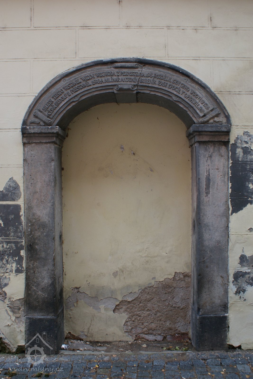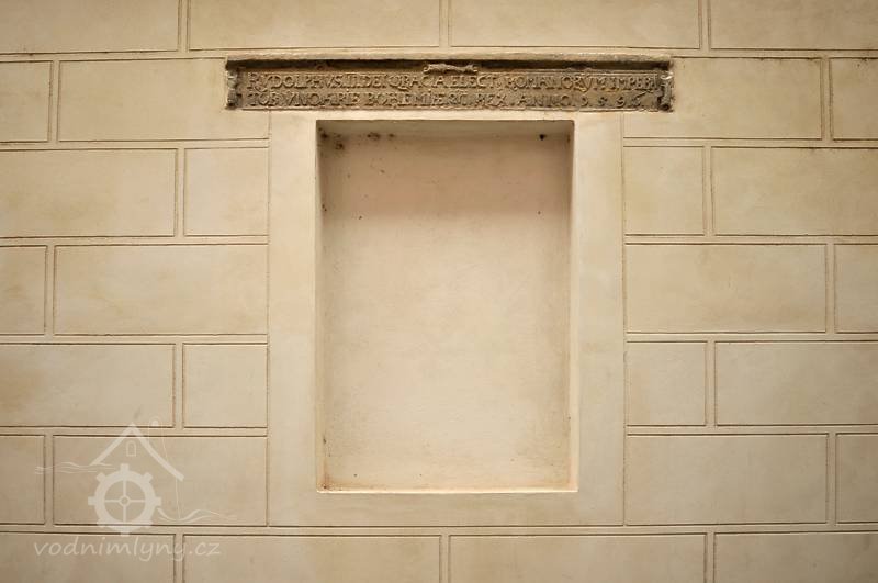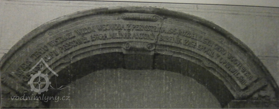 "Mleyn tento wystawel Wilym wegwoda z Pernssteina 1515. Rozdelil syn geho geho Wogtech 1531. Cisař Rudolf II prestawel 1596 a mlinar Antonin Bubenik zase spogil y oprawil 1811."