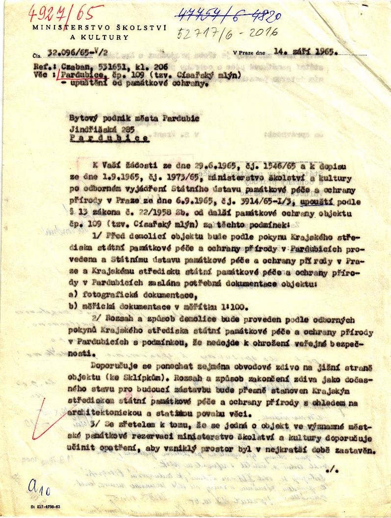 Roku 1910 Císařský mlýn koupilo město Pardubice a ještě v témže roce v souvislosti s regulací řeky Chrudimky a na ní napojené Městské strouhy mlýnský provoz zrušila.