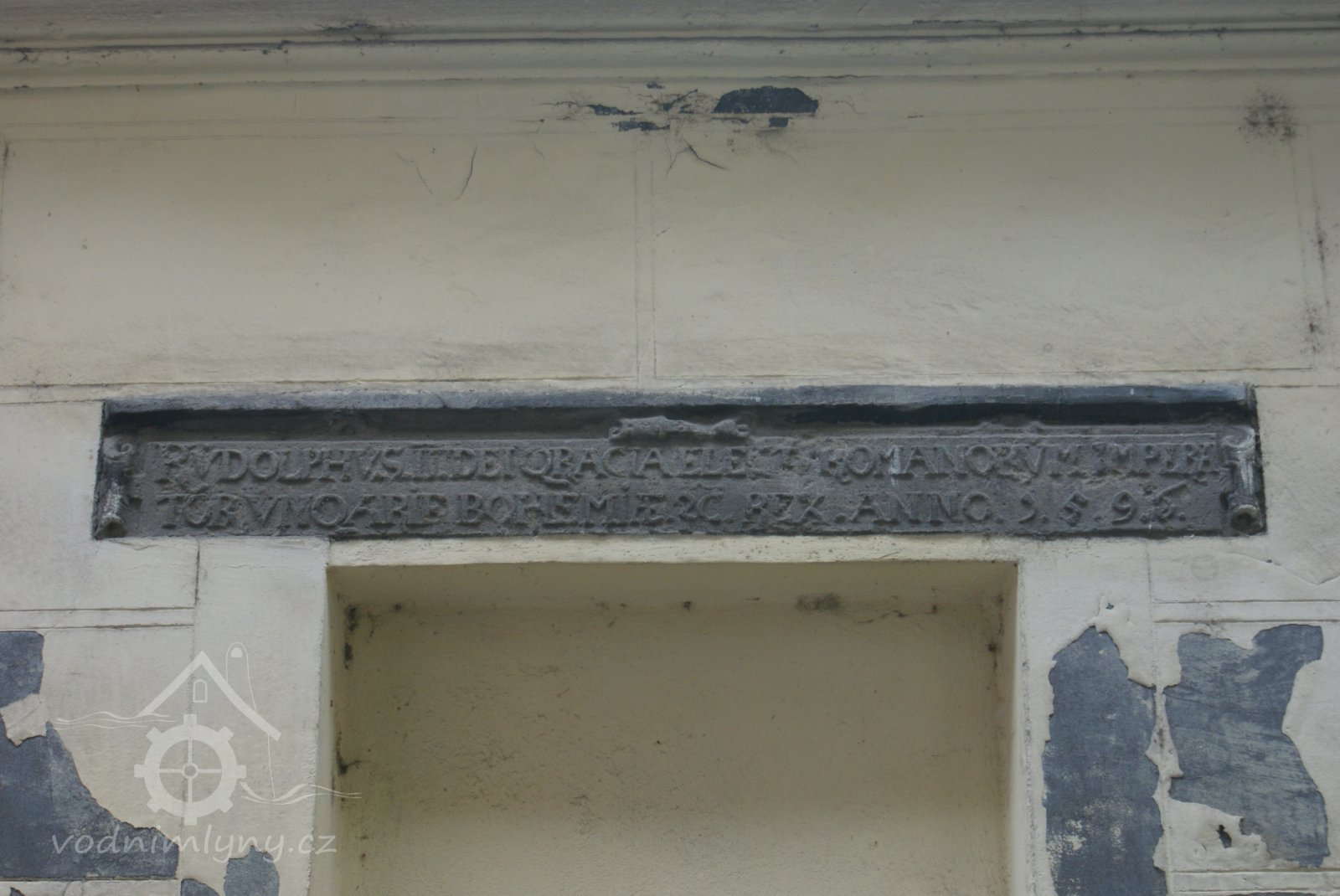Na obdélném kameni (překlad portálu?) latinský nápis z roku 1596.