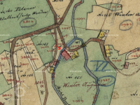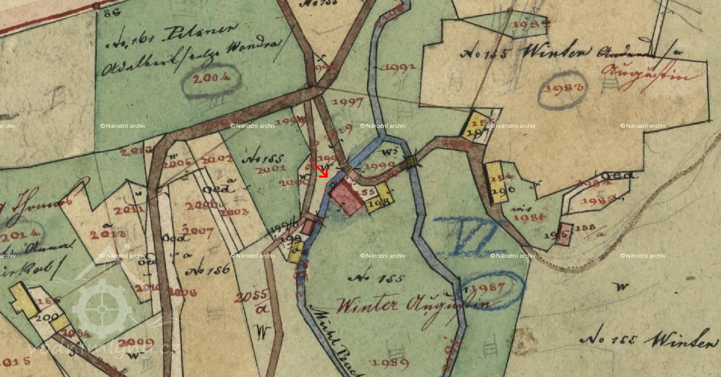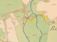 Mlýn čp.155/st.p.198/2 v k.ú.Stachy.Původní situace je zakreslena na mapě Stabilního katastru Čechy:7217-1, mapový list č.004.- viz.snímek výše.K uvedené usedlosti ještě majetkově patřily následující stavby/stav r.1945/: dům-obytné a hospodářské stavení čp.256/st.p.198/1,zbořeniště domu čp.158/st.p.195,dům čp.154/st.p.197,pila/st.p.199 a kolna/st.p.231.