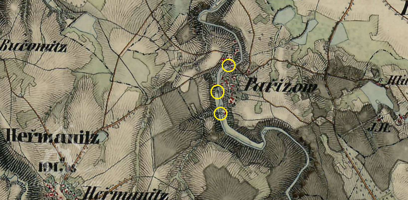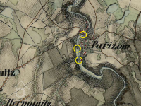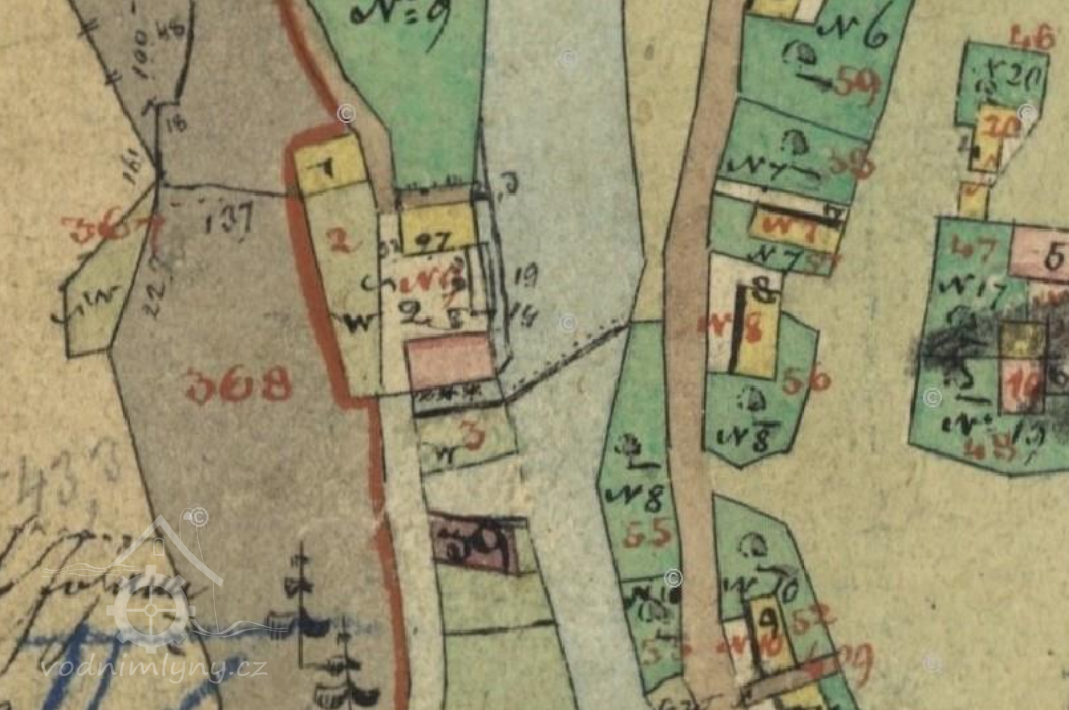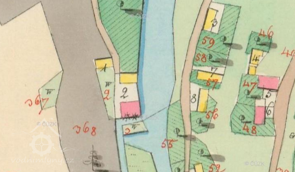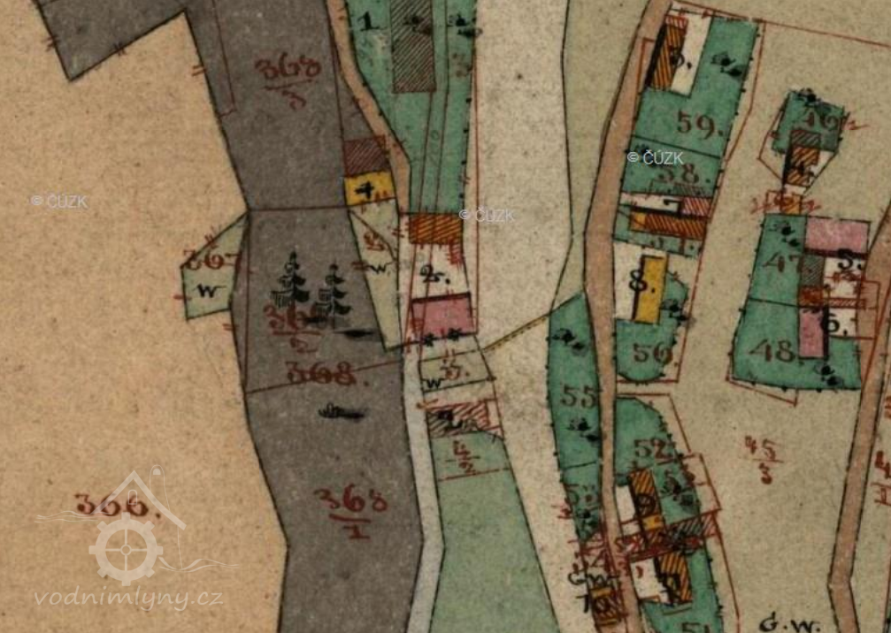 Pozemky pare, č. 412. 4/2 a 3 (pozemek, kde stával vyhořely předchůdce nynějšího mlýna):